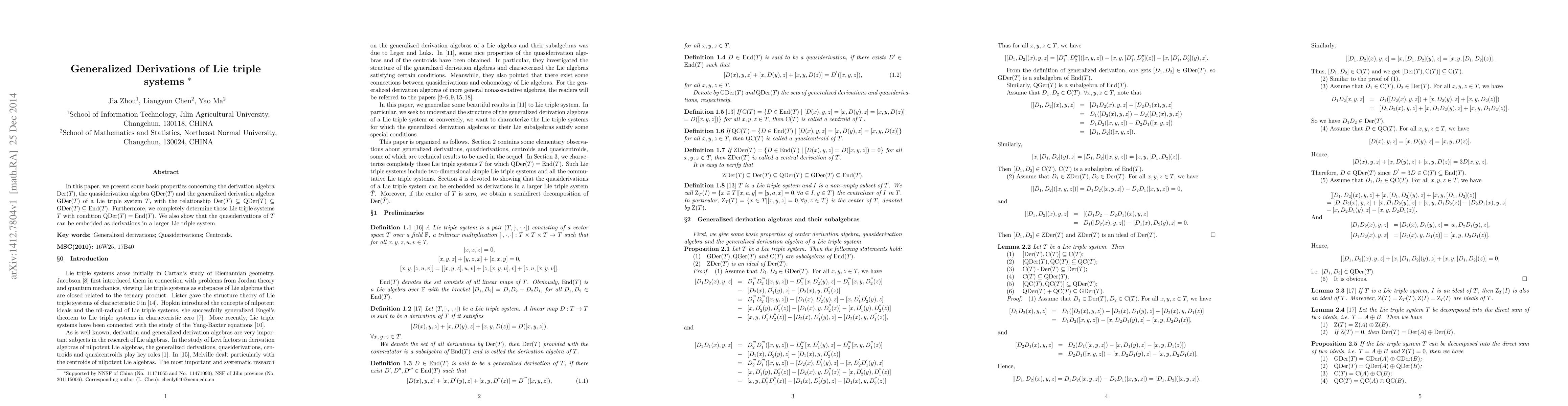 In this paper, we present some basic properties concerning the derivation algebra ${\rm Der}(T)$, the quasiderivation algebra ${\rm QDer}(T)$ and the generalized derivation algebra ${\rm GDer}(T)$ of a Lie triple system $T$, with the relationship ${\rm Der}(T)\subseteq {\rm QDer}(T)\subseteq {\rm GDer}(T)\subseteq {\rm End}(T)$. Furthermore, we completely determine those Lie triple systems $T$ with condition ${\rm QDer}(T)={\rm End}(T)$. We also show that the quasiderivations of $T$ can be embedded as derivations in a larger Lie triple system.