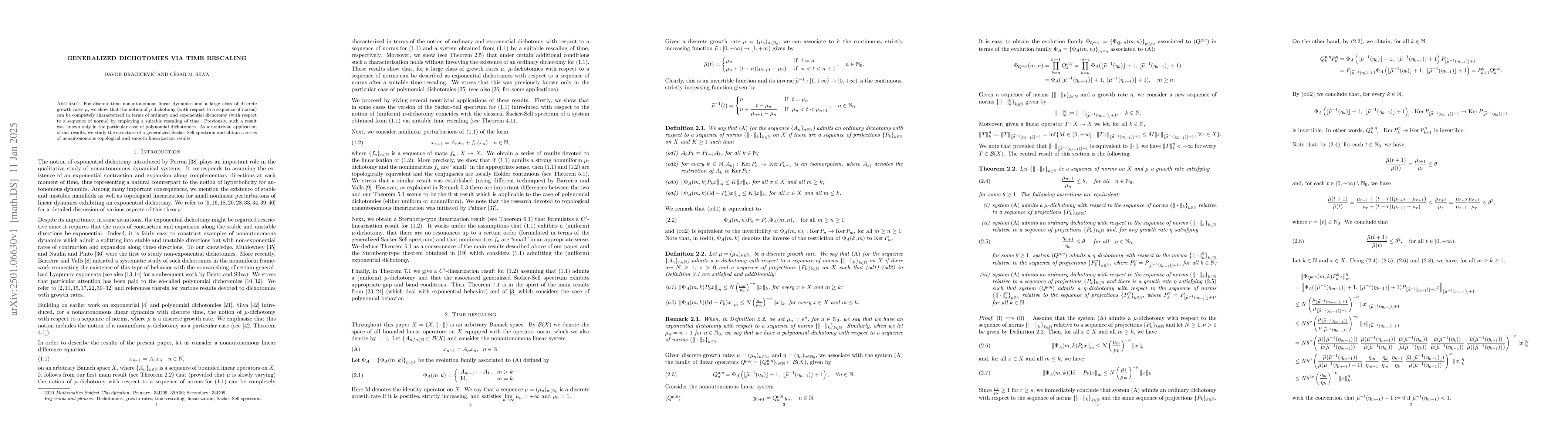 For discrete-time nonautonomous linear dynamics and a large class of discrete growth rates $\mu$, we show that the notion of $\mu$ dichotomy (with respect to a sequence of norms) can be completely characterized in terms of ordinary and exponential dichotomy (with respect to a sequence of norms) by employing a suitable rescaling of time. Previously, such a result was known only in the particular case of polynomial dichotomies. As a nontrivial application of our results, we study the structure of a generalized Sacker-Sell spectrum and obtain a series of nonautonomous topological and smooth linearization results.