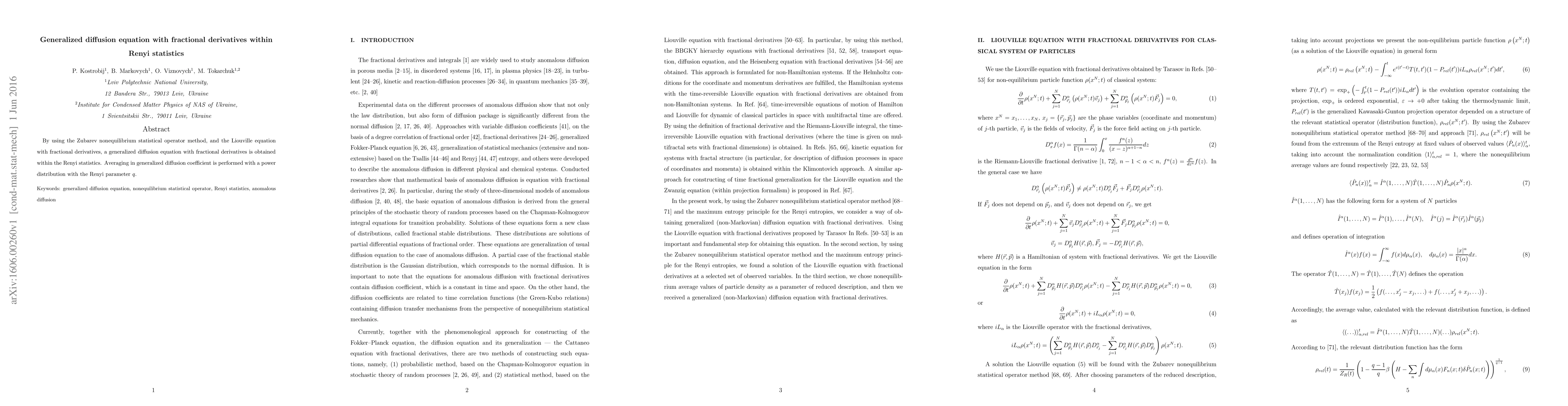 Summary: This paper derives a generalized diffusion equation incorporating fractional derivatives and Renyi statistics using Zubarev's nonequilibrium method and the Liouville equation. The diffusion coefficient is averaged with a power distribution defined by the Renyi parameter $q$.