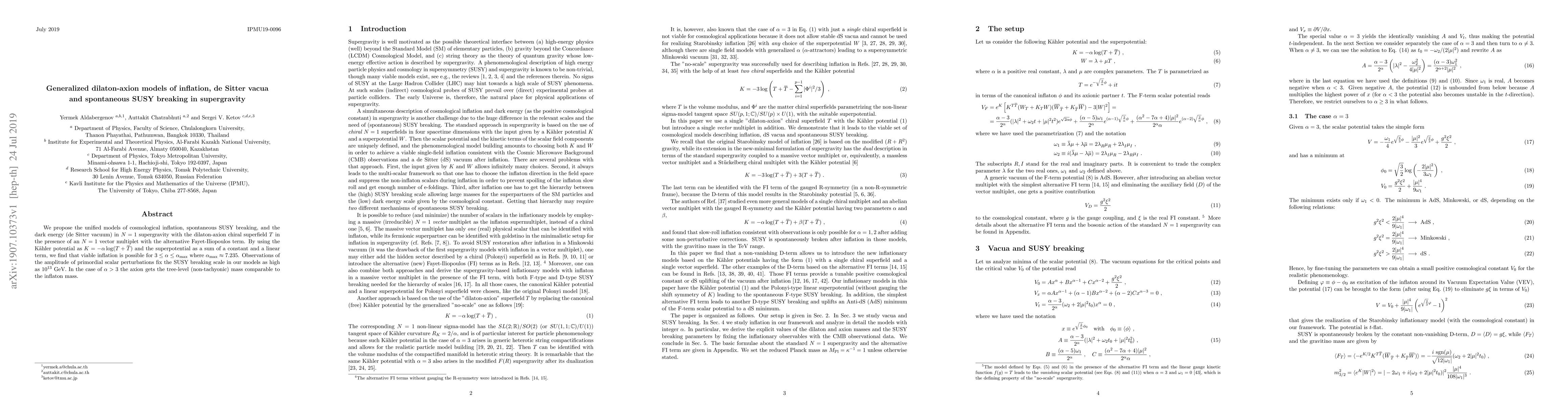 This paper proposes unified models in $N=1$ supergravity for inflation, spontaneous SUSY breaking, and dark energy using a dilaton-axion chiral superfield $T$ with a specific Kähler potential and superpotential. It finds viable inflation occurs for $3 \leq \alpha \leq \alpha_{\rm max} \approx 7.235$, with the SUSY breaking scale fixed at $10^{13}$ GeV by primordial scalar perturbations.