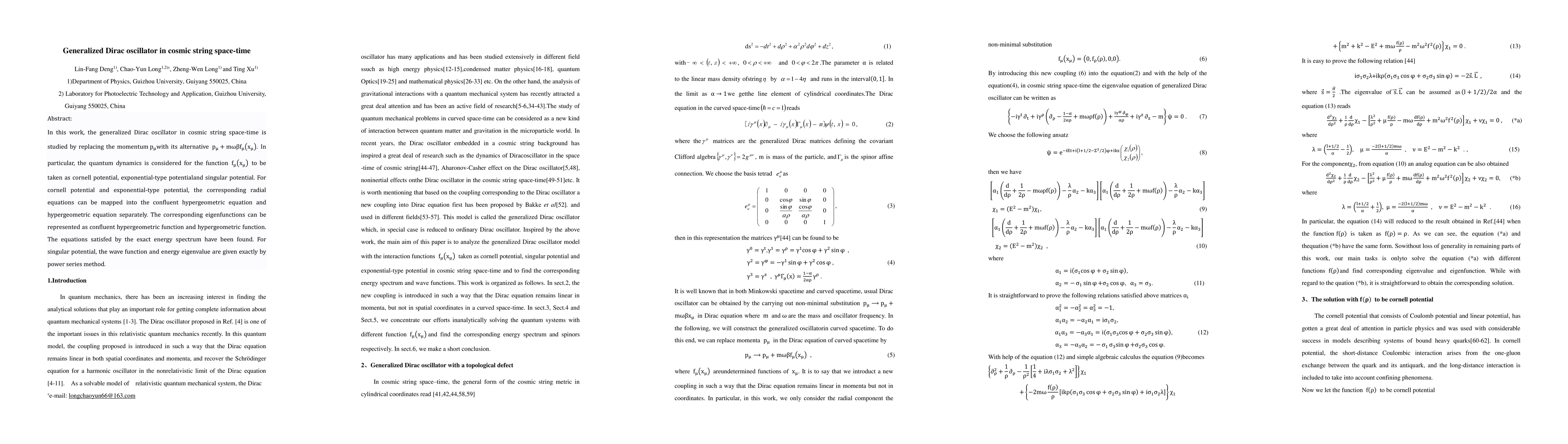 This paper investigates a generalized Dirac oscillator in cosmic string space-time, finding exact energy spectra for different potentials, including Cornell, exponential-type, and singular.