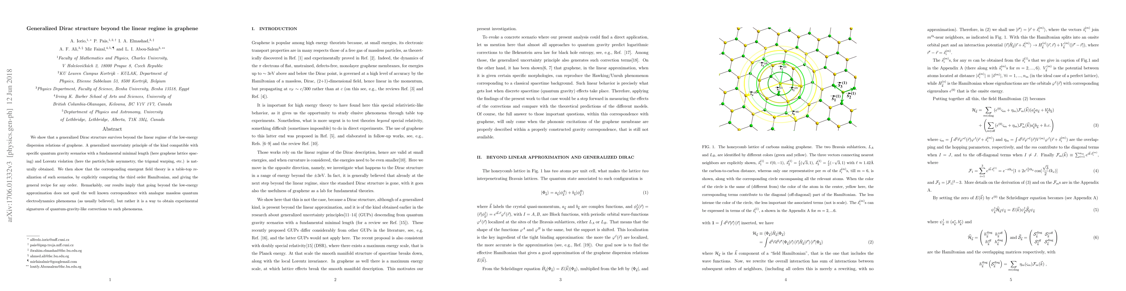 We show that a generalized Dirac structure survives beyond the linear regime of the low-energy dispersion relations of graphene. A generalized uncertainty principle of the kind compatible with specific quantum gravity scenarios with a fundamental minimal length (here graphene lattice spacing) and Lorentz violation (here the particle/hole asymmetry, the trigonal warping, etc.) is naturally obtained. We then show that the corresponding emergent field theory is a table-top realization of such scenarios, by explicitly computing the third order Hamiltonian, and giving the general recipe for any order. Remarkably, our results imply that going beyond the low-energy approximation does not spoil the well-known correspondence with analogue massless quantum electrodynamics phenomena (as usually believed), but rather it is a way to obtain experimental signatures of quantum-gravity-like corrections to such phenomena.