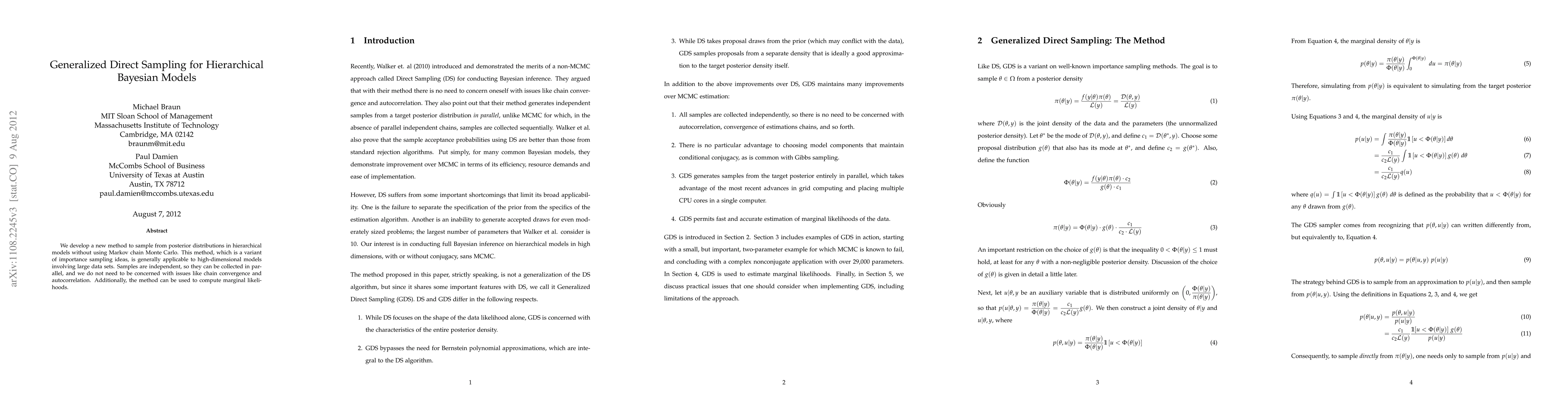 This research introduces a novel method for sampling from posterior distributions in hierarchical models, bypassing the need for Markov Chain Monte Carlo. The approach, based on importance sampling, generates independent samples suitable for parallel collection, eliminating concerns around convergence and autocorrelation. It also allows for marginal likelihood computation.