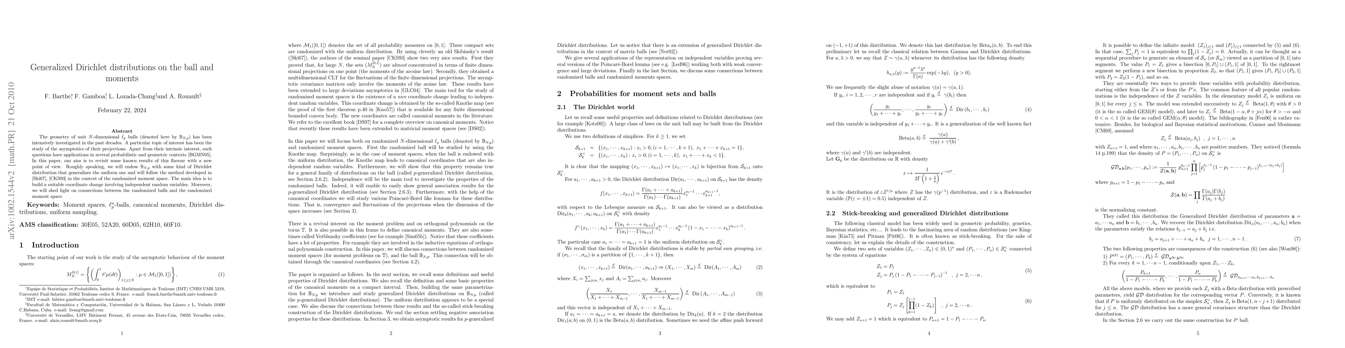 This paper revisits projection asymptotics of unit N-dimensional u03c3_p balls, generalizing the uniform distribution with Dirichlet distributions. It employs a method akin to Skibinsky (1967) and Chang et al. (1993), introducing a coordinate change involving independent random variables. The research uncovers a connection between randomized balls and randomized moment space.