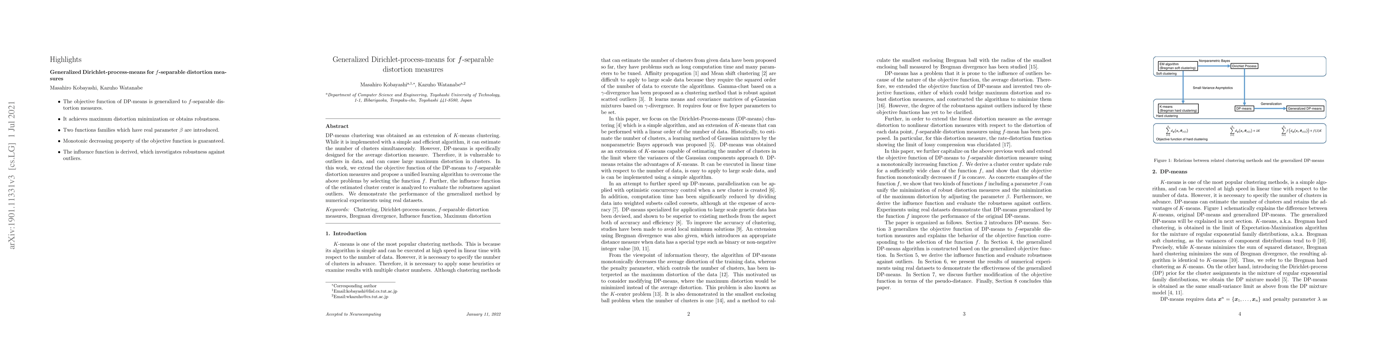 DP-means clustering was obtained as an extension of $K$-means clustering. While it is implemented with a simple and efficient algorithm, it can estimate the number of clusters simultaneously. However, DP-means is specifically designed for the average distortion measure. Therefore, it is vulnerable to outliers in data, and can cause large maximum distortion in clusters. In this work, we extend the objective function of the DP-means to $f$-separable distortion measures and propose a unified learning algorithm to overcome the above problems by selecting the function $f$. Further, the influence function of the estimated cluster center is analyzed to evaluate the robustness against outliers. We demonstrate the performance of the generalized method by numerical experiments using real datasets.