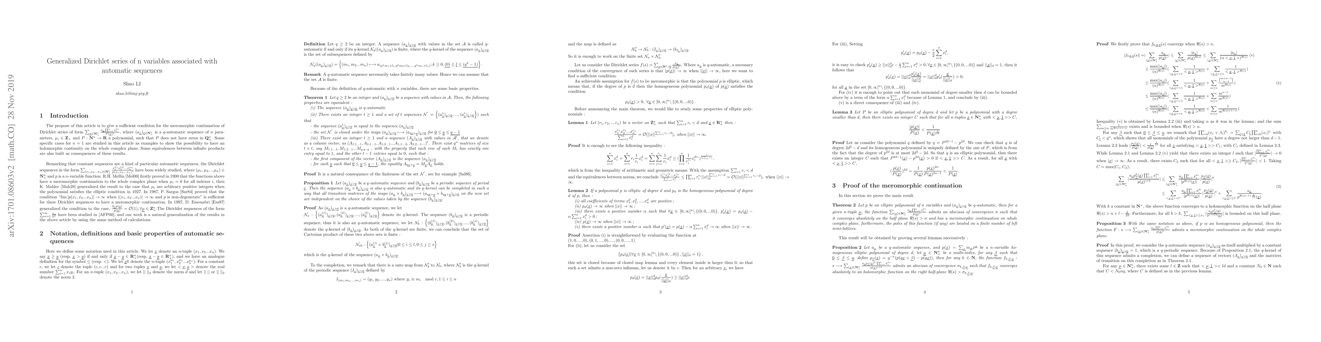 This article consists to give a necessary and sufficient condition of the meromorphic continuity of Dirichlet series defined as $\sum_{x\in \mathbf{N}^n} \frac{a_{x}}{P(x)^s}$, Where $a_{x}$ is a $q$-automatic sequence of $n$ parameters and $P: \mathbf{C}^n \to \mathbf{C}$ a polynomial, such that $P$ does not have zeros on $\mathbf{Q}^{n}_{+}$. And some specific cases of $n=1$ will also be studied in this article as examples to show the possibility to have an holomorphic continuity on the whole complex plane. Some equivalences between infinite products are also built as consequences of these results.