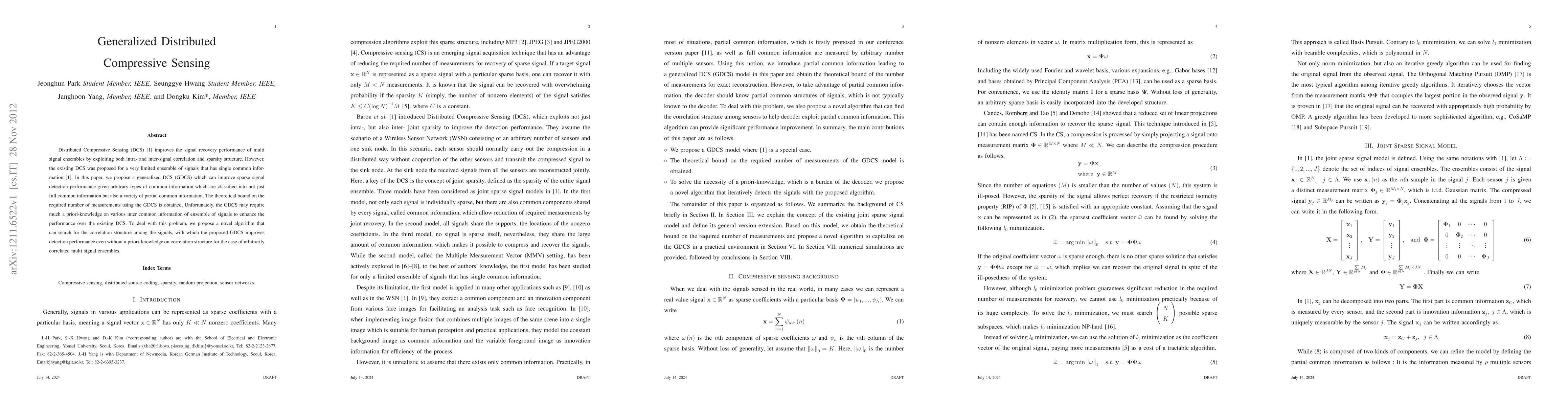 This paper proposes a generalized distributed compressive sensing (GDCS) framework that enhances sparse signal detection across diverse signal ensembles by leveraging various types of common information, including both full and partial correlations. It introduces a novel algorithm to discover signal correlations without prior knowledge, improving performance over existing DCS methods.