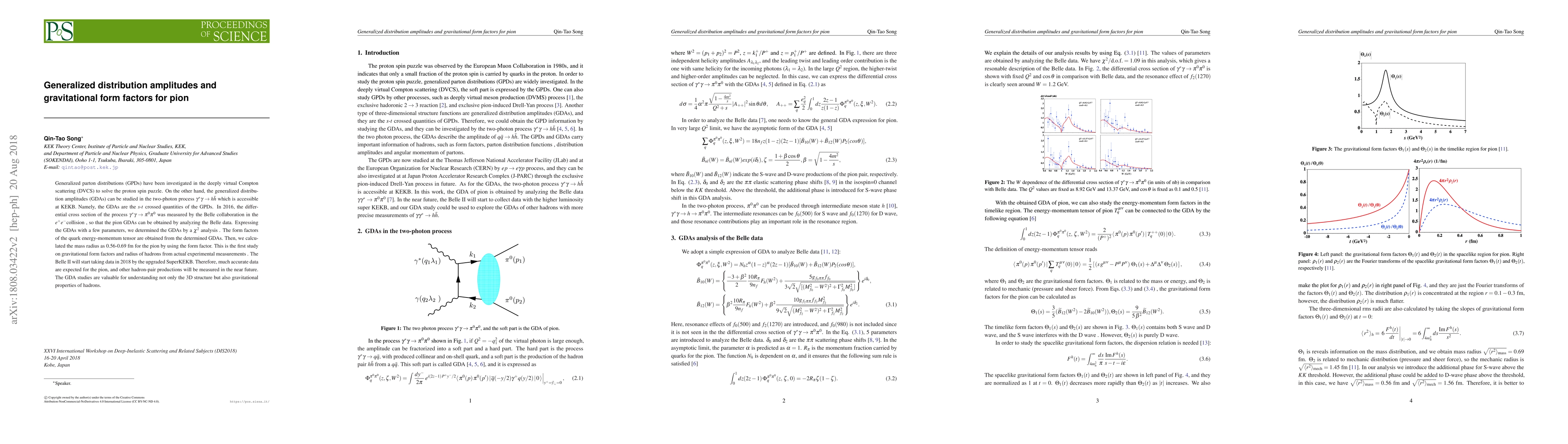Generalized parton distributions (GPDs) have been investigated in the deeply virtual Compton scattering (DVCS) to solve the proton spin puzzle. On the other hand, the generalized distribution amplitudes (GDAs) can be studied in the two-photon process $\gamma^* \gamma \rightarrow h \bar{h}$ which is accessible at KEKB. Namely, the GDAs are the $s$-$t$ crossed quantities of the GPDs. In 2016, the differential cross section of the process $\gamma^* \gamma \rightarrow \pi^0 \pi^0$ was measured by the Belle collaboration in the $e^+e^-$collision , so that the pion GDAs can be obtained by analyzing the Belle data. Expressing the GDAs with a few parameters, we determined the GDAs by a $\chi^2$ analysis . The form factors of the quark energy-momentum tensor are obtained from the determined GDAs. Then, we calculated the mass radius as 0.56-0.69 fm for the pion by using the form factor. This is the first study on gravitational form factors and radius of hadrons from actual experimental measurements . The Belle II will start taking data in 2018 by the upgraded SuperKEKB. Therefore, much accurate data are expected for the pion, and other hadron-pair productions will be measured in the near future. The GDA studies are valuable for understanding not only the 3D structure but also gravitational properties of hadrons.