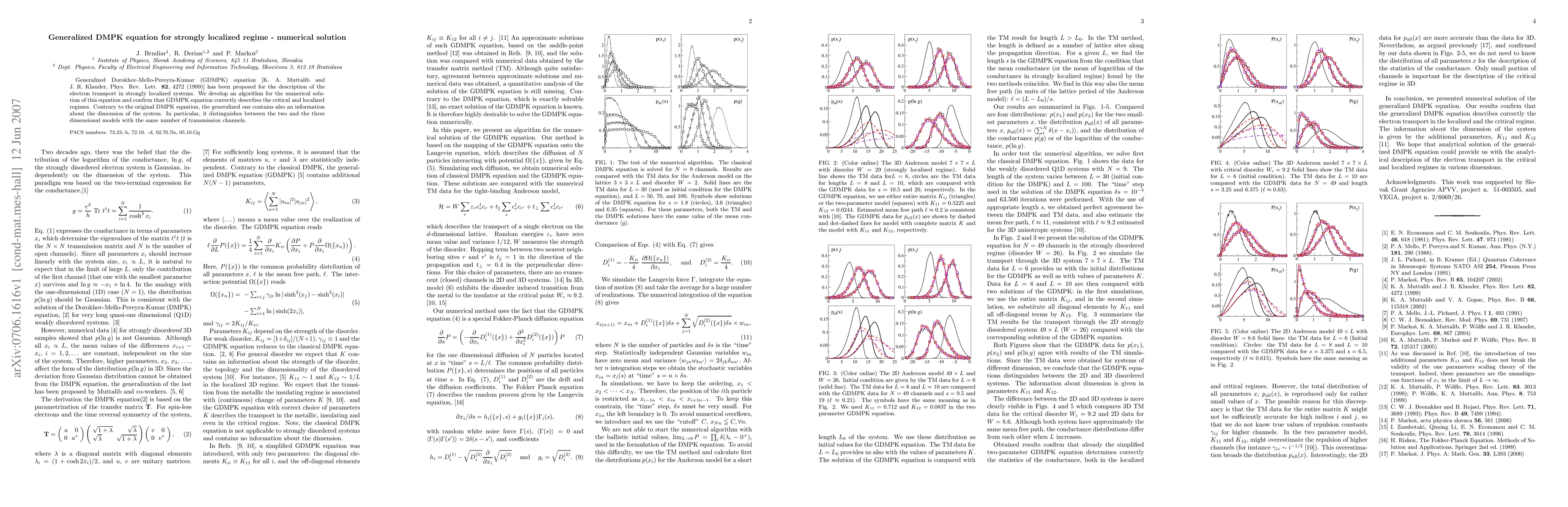 Generalized Dorokhov-Mello-Pereyra-Kumar (GDMPK) equation [K. A. Muttalib and J. R. Klauder, Phys. Rev. Lett. {\bf 82}, 4272 (1999)] has been proposed for the description of the electron transport in strongly localized systems. We develop an algorithm for the numerical solution of this equation and confirm that GDMPK equation correctly describes the critical and localized regimes. Contrary to the original DMPK equation, the generalized one contains also an information about the dimension of the system. In particular, it distinguishes between the two and the three dimensional models with the same number of transmission channels.