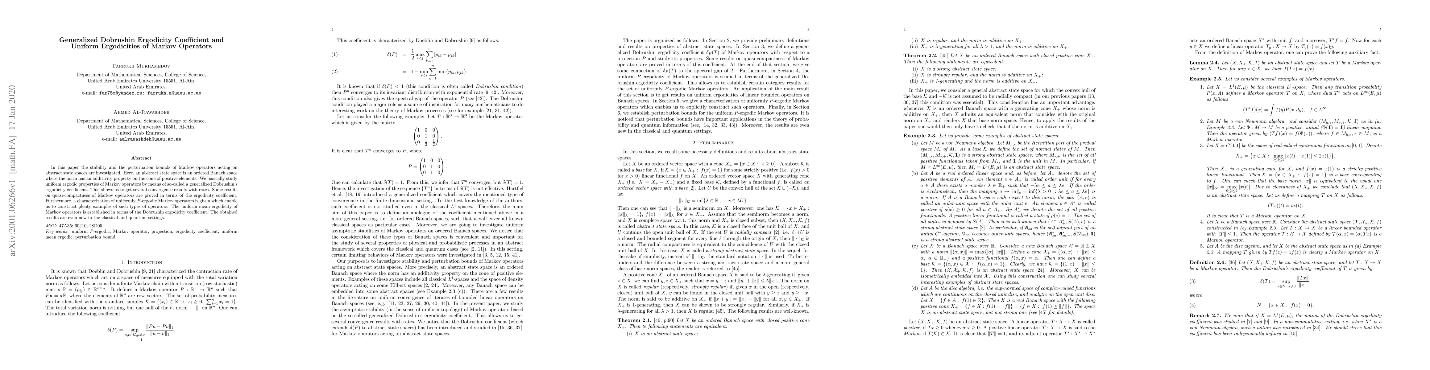 In this paper the stability and the perturbation bounds of Markov operators acting on abstract state spaces are investigated. Here, an abstract state space is an ordered Banach space where the norm has an additivity property on the cone of positive elements. We basically study uniform ergodic properties of Markov operators by means of so-called a generalized Dobrushin's ergodicity coefficient. This allows us to get several convergence results with rates. Some results on quasi-compactness of Markov operators are proved in terms of the ergodicity coefficient. Furthermore, a characterization of uniformly $P$-ergodic Markov operators is given which enable us to construct plenty examples of such types of operators. The uniform mean ergodicity of Markov operators is established in terms of the Dobrushin ergodicity coefficient. The obtained results are even new in the classical and quantum settings