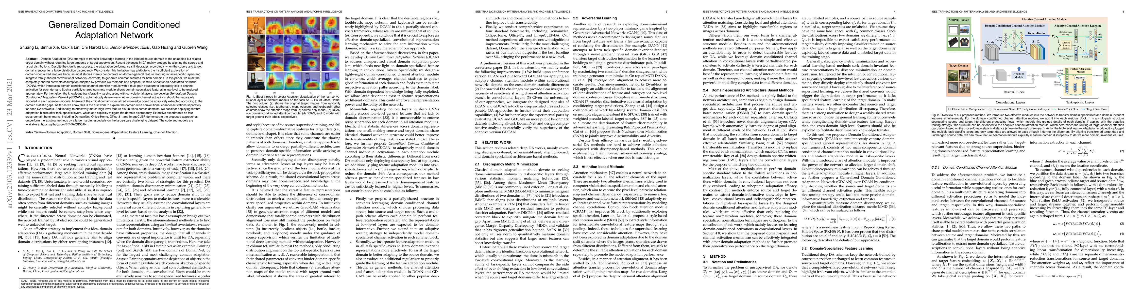 Domain Adaptation (DA) attempts to transfer knowledge learned in the labeled source domain to the unlabeled but related target domain without requiring large amounts of target supervision. Recent advances in DA mainly proceed by aligning the source and target distributions. Despite the significant success, the adaptation performance still degrades accordingly when the source and target domains encounter a large distribution discrepancy. We consider this limitation may attribute to the insufficient exploration of domain-specialized features because most studies merely concentrate on domain-general feature learning in task-specific layers and integrate totally-shared convolutional networks (convnets) to generate common features for both domains. In this paper, we relax the completely-shared convnets assumption adopted by previous DA methods and propose Domain Conditioned Adaptation Network (DCAN), which introduces domain conditioned channel attention module with a multi-path structure to separately excite channel activation for each domain. Such a partially-shared convnets module allows domain-specialized features in low-level to be explored appropriately. Further, given the knowledge transferability varying along with convolutional layers, we develop Generalized Domain Conditioned Adaptation Network (GDCAN) to automatically determine whether domain channel activations should be separately modeled in each attention module. Afterward, the critical domain-specialized knowledge could be adaptively extracted according to the domain statistic gaps. As far as we know, this is the first work to explore the domain-wise convolutional channel activations separately for deep DA networks. Additionally, to effectively match high-level feature distributions across domains, we consider deploying feature adaptation blocks after task-specific layers, which can explicitly mitigate the domain discrepancy.