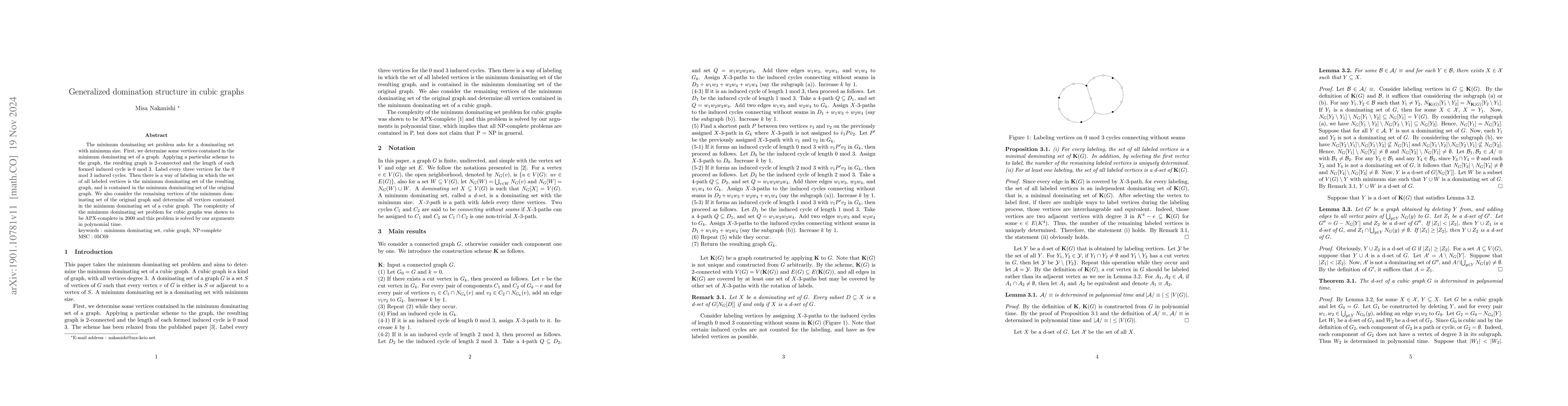This paper explores the generalized domination structure in cubic graphs, demonstrating that a minimum dominating set can be constructed using two cycles of length 0 mod 3 intersecting with one path. The authors prove that the minimum dominating set for cubic graphs can be determined in polynomial time.