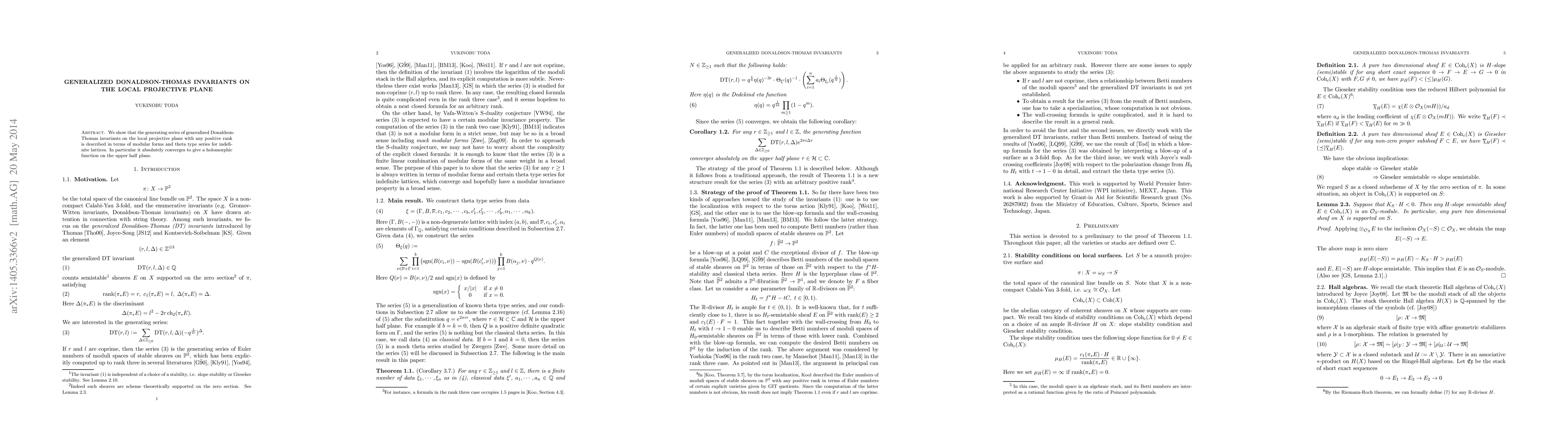 This paper demonstrates that the generating series for generalized Donaldson-Thomas invariants on the local projective plane can be expressed using modular forms and theta series for indefinite lattices, and it converges to a holomorphic function on the upper half plane.