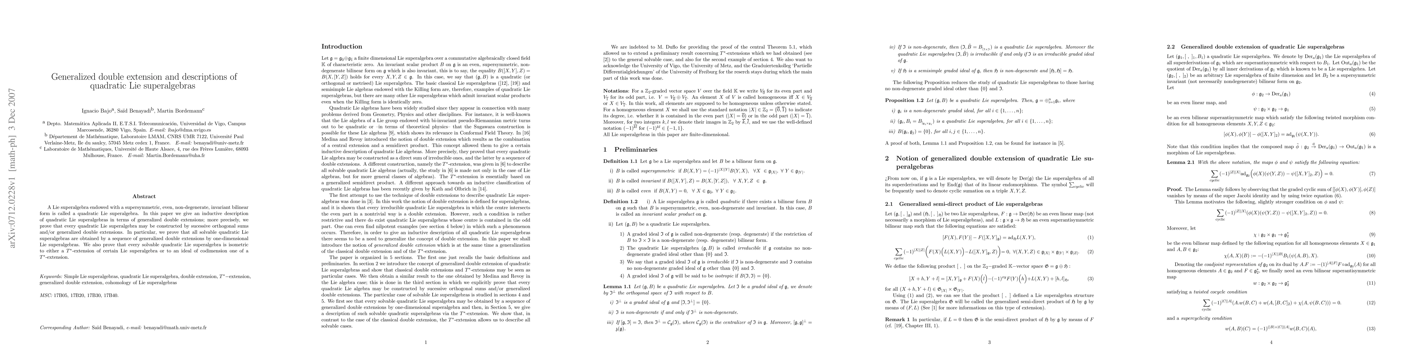 Summary: This paper explores the structure of quadratic Lie superalgebras using inductive descriptions via generalized double extensions, focusing on their supersymmetric, even, and invariant bilinear forms. The authors provide a detailed framework for understanding these Lie superalgebras through their extensions.