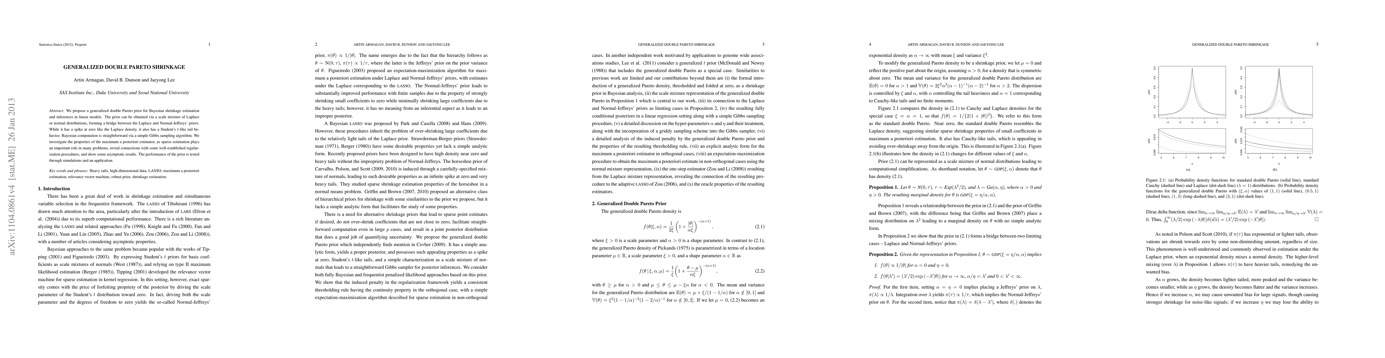 This paper introduces a generalized double Pareto prior for Bayesian shrinkage in linear models, combining features of Laplace and Normal-Jeffreys' priors. The method employs a Gibbs sampling algorithm for Bayesian computation and demonstrates its effectiveness through simulations and an application.