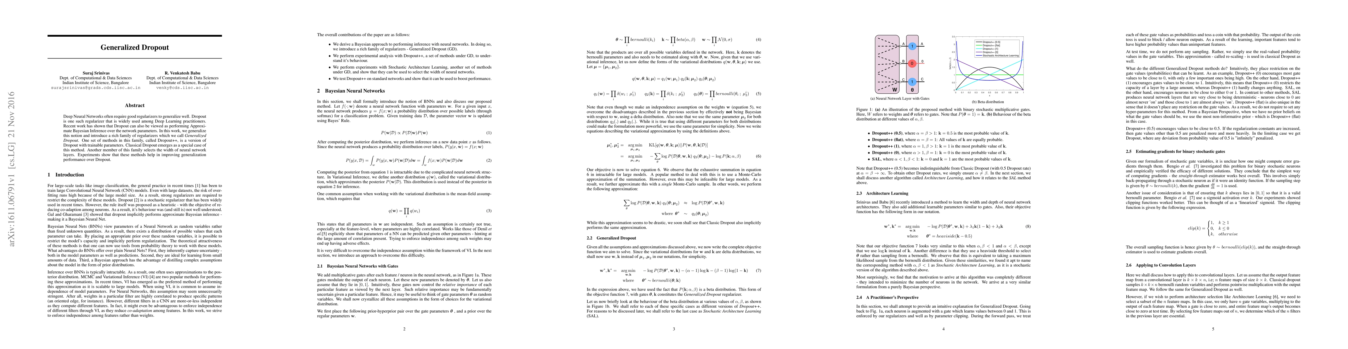 Deep Neural Networks often require good regularizers to generalize well. Dropout is one such regularizer that is widely used among Deep Learning practitioners. Recent work has shown that Dropout can also be viewed as performing Approximate Bayesian Inference over the network parameters. In this work, we generalize this notion and introduce a rich family of regularizers which we call Generalized Dropout. One set of methods in this family, called Dropout++, is a version of Dropout with trainable parameters. Classical Dropout emerges as a special case of this method. Another member of this family selects the width of neural network layers. Experiments show that these methods help in improving generalization performance over Dropout.