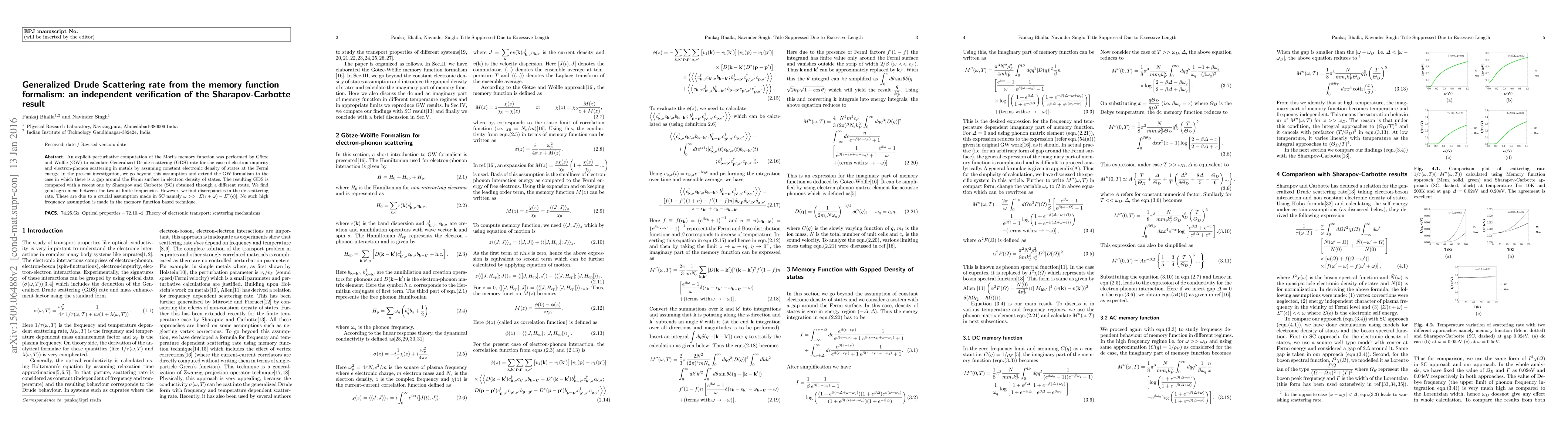 An explicit perturbative computation of the Mori's memory function was performed by G\"otze and W\"olfle (GW) to calculate Generalized Drude scattering (GDS) rate for the case of electron-impurity and electron-phonon scattering in metals by assuming constant electronic density of states at the Fermi energy. In the present investigation, we go beyond this assumption and extend the GW formalism to the case in which there is a gap around the Fermi surface in electron density of states. The resulting GDS is compared with a recent one by Sharapov and Carbotte (SC) obtained through a different route. We find good agreement between the two at finite frequencies. However, we find discrepancies in the dc scattering rate. These are due to a crucial assumption made in SC namely $\omega >> \vert \Sigma(\epsilon+\omega) - \Sigma^{*}(\epsilon)\vert$. No such high frequency assumption is made in the memory function based technique.