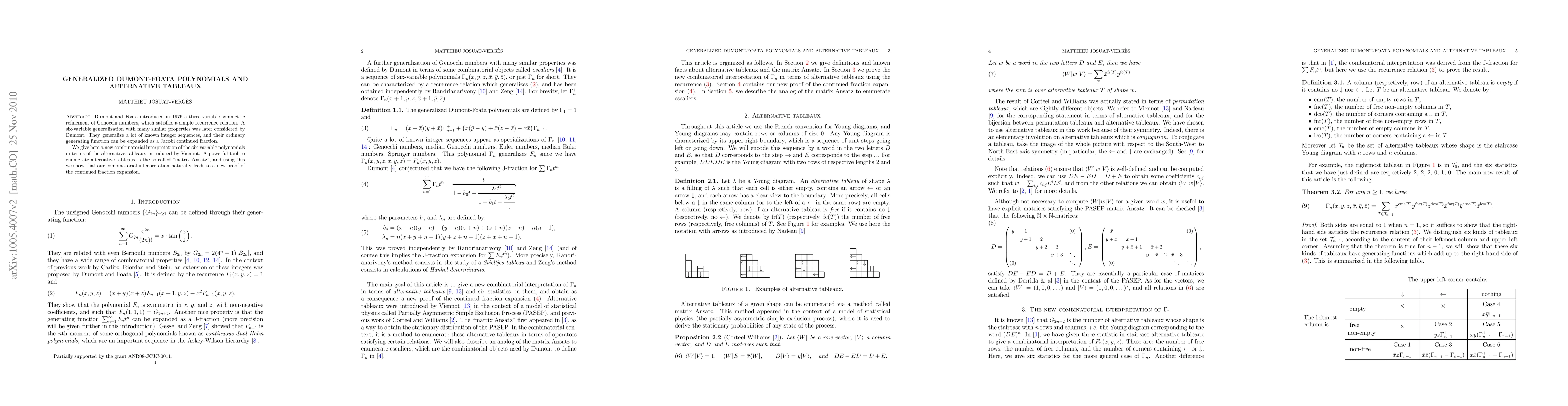 Dumont and Foata introduced in 1976 a three-variable symmetric refinement of Genocchi numbers, which satisfies a simple recurrence relation. A six-variable generalization with many similar properties was later considered by Dumont. They generalize a lot of known integer sequences, and their ordinary generating function can be expanded as a Jacobi continued fraction. We give here a new combinatorial interpretation of the six-variable polynomials in terms of the alternative tableaux introduced by Viennot. A powerful tool to enumerate alternative tableaux is the so-called "matrix Ansatz", and using this we show that our combinatorial interpretation naturally leads to a new proof of the continued fraction expansion.
