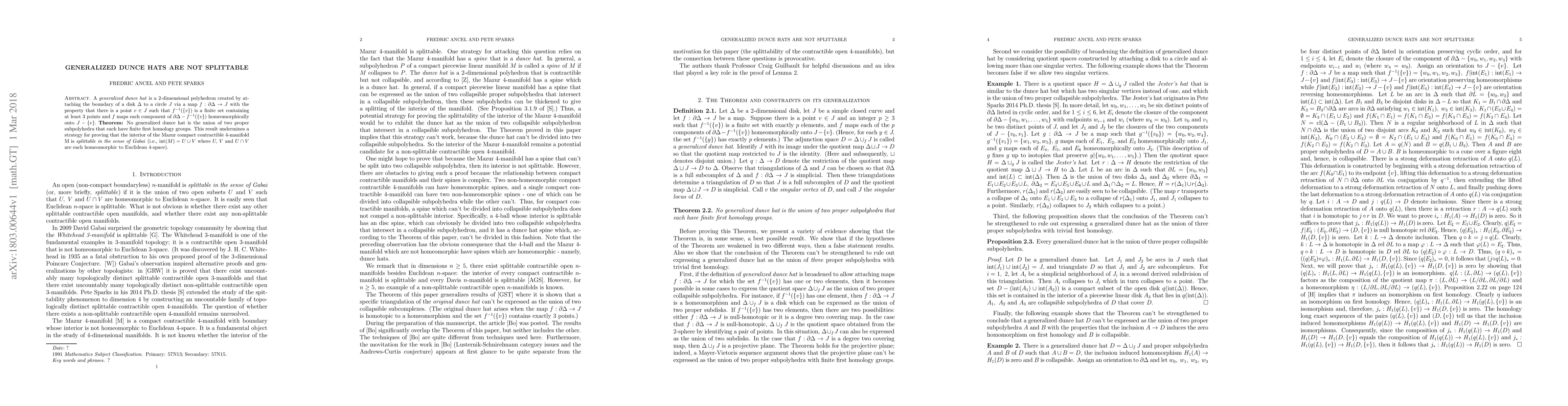 A \emph{generalized dunce hat} is a 2-dimensional polyhedron created by attaching the boundary of a disk $\Delta$ to a circle $J$ via a map $f:\partial \Delta \to J$ with the property that there is a point $v \in J$ such that $f^{-1}(\{v\})$ is a finite set containing at least 3 points and $f$ maps each component of $\partial \Delta - f^{-1}(\{v\})$ homeomorphically onto $J - \{v\}.$ \textbf{Theorem:} No generalized dunce hat is the union of two proper subpolyhedra that each have finite first homology groups. This result undermines a strategy for proving that the interior of the Mazur compact contractible 4-manifold M is \emph{splittable in the sense of Gabai} (i.e., $\intr(M) = U \cup V$ where $U,$ $V$ and $U \cap V$ are each homeomorphic to Euclidean 4-space).