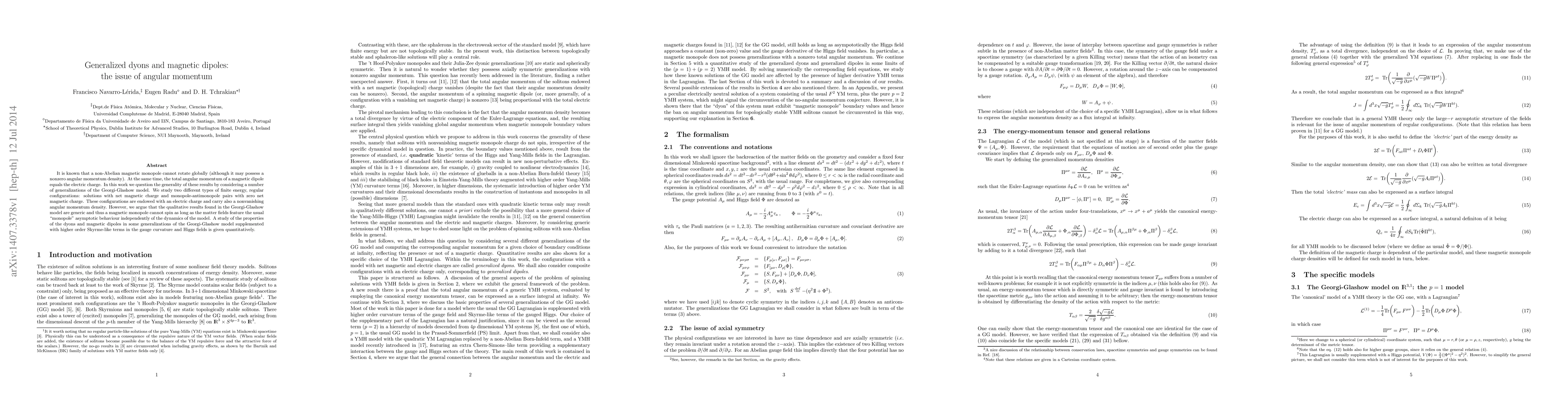 This paper investigates the angular momentum of generalized dyons and magnetic dipoles in various extensions of the Georgi-Glashow model, finding that non-Abelian magnetic monopoles cannot rotate globally despite possessing angular momentum density, while magnetic dipoles' total angular momentum equals their electric charge. The study concludes that these results are generic and hold true regardless of the model's dynamics.