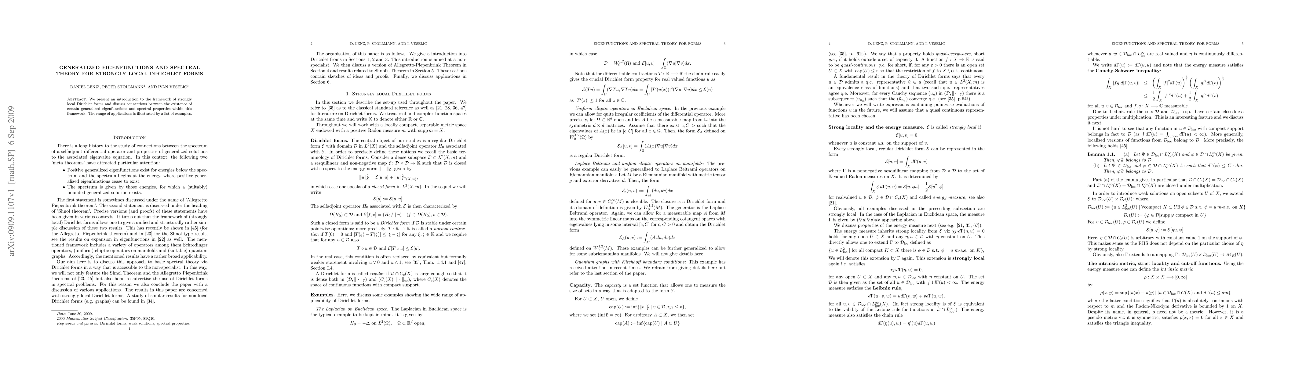 This paper introduces strongly local Dirichlet forms and explores the relationship between generalized eigenfunctions and spectral properties. It provides examples to illustrate the practical applications of this framework.