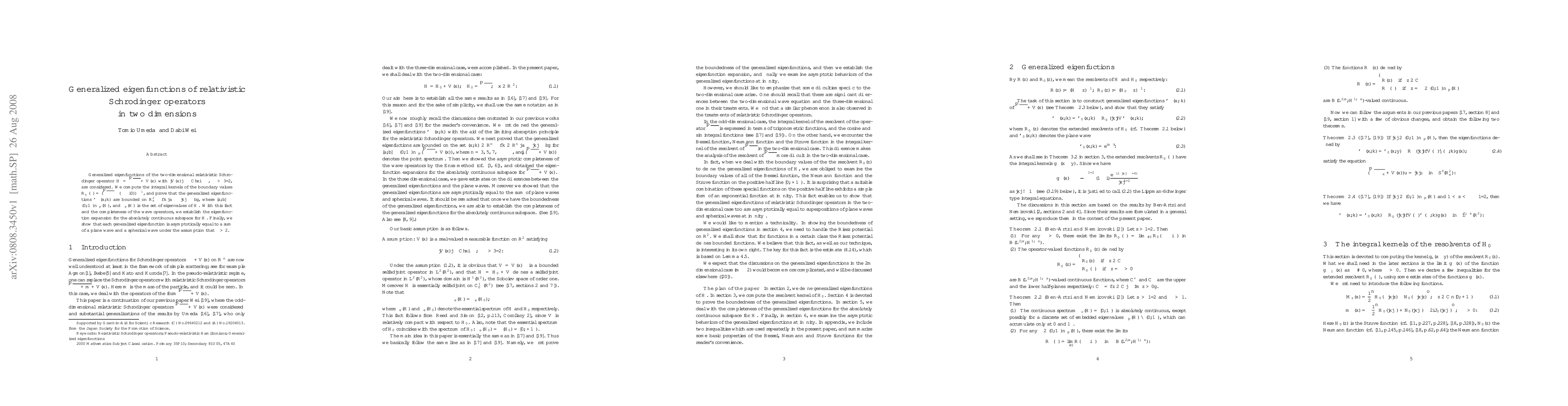 This paper investigates the generalized eigenfunctions of a two-dimensional relativistic Schrödinger operator, proving their boundedness and establishing an eigenfunction expansion for the absolutely continuous subspace. It also demonstrates the asymptotic behavior of these eigenfunctions as a combination of plane and spherical waves under certain conditions.