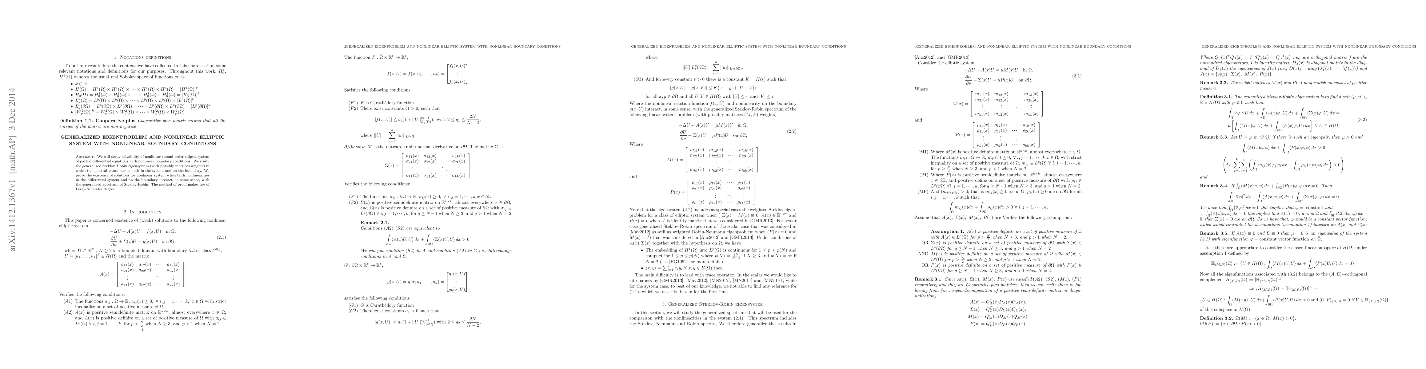We will study solvability of nonlinear second-order elliptic system of partial differential equations with nonlinear boundary conditions. We study the generalized Steklov Robin eigensystem (with possibly matrices weights) in which the spectral parameter is both in the system and on the boundary. We prove the existence of solutions for nonlinear system when both nonlinearities in the differential system and on the boundary interact, in some sense, with the generalized spectrum of Steklov Robin. The method of proof makes use of Leray-Schauder degree.