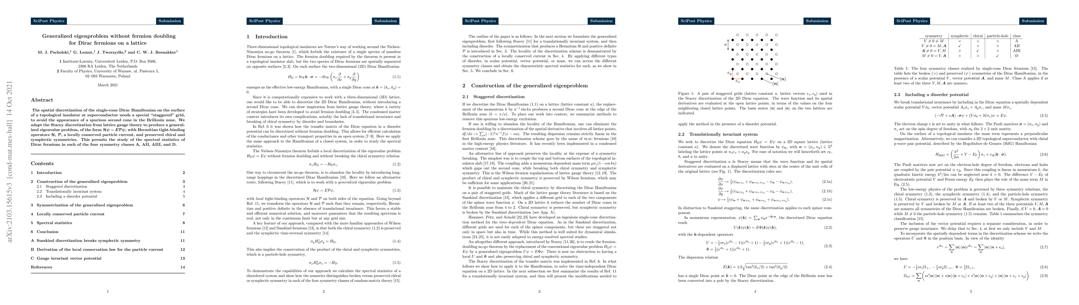 The research presents a novel lattice fermion Hamiltonian that preserves both chiral and symplectic symmetries without fermion doubling, achieved through a symmetrized version of Stacey's generalized eigenvalue problem, allowing for the construction of a locally conserved particle current.