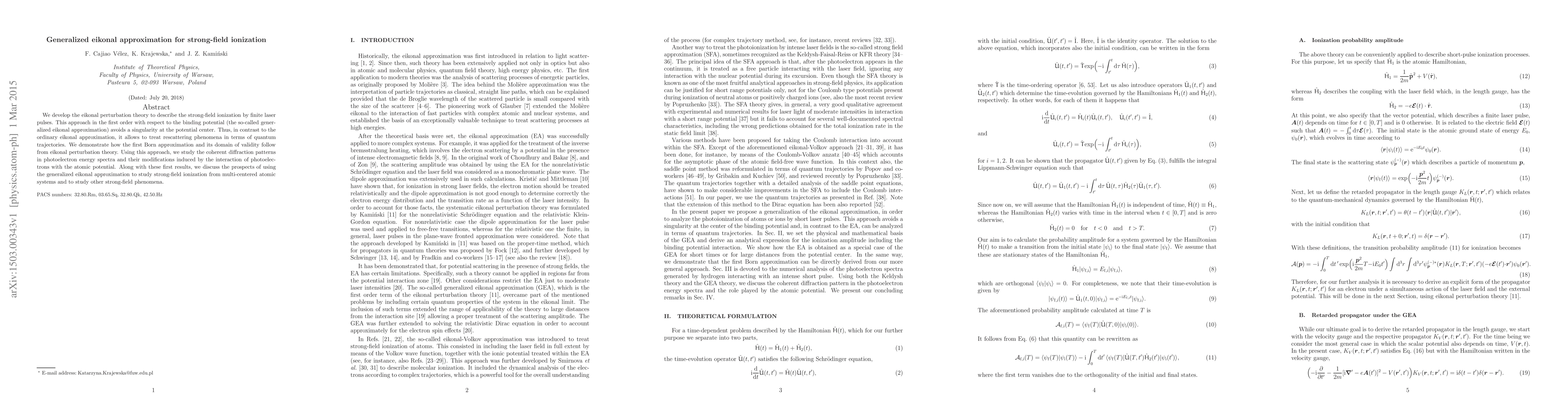 This paper develops the generalized eikonal approximation to describe strong-field ionization by finite laser pulses, avoiding singularities and enabling treatment of rescattering phenomena. It also explores coherent diffraction patterns in photoelectron energy spectra and discusses its applications to multi-centered atomic systems.