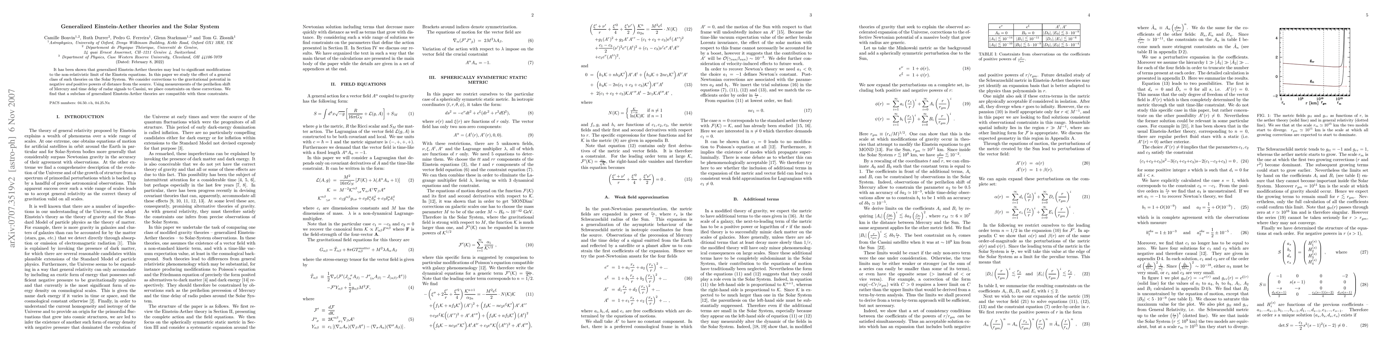 This research examines generalized Einstein-Aether theories' impact on the Solar System, finding a subclass compatible with constraints from Mercury's perihelion shift and Cassini radar signal delays. It explores modifications to gravitational potential at various distance powers.