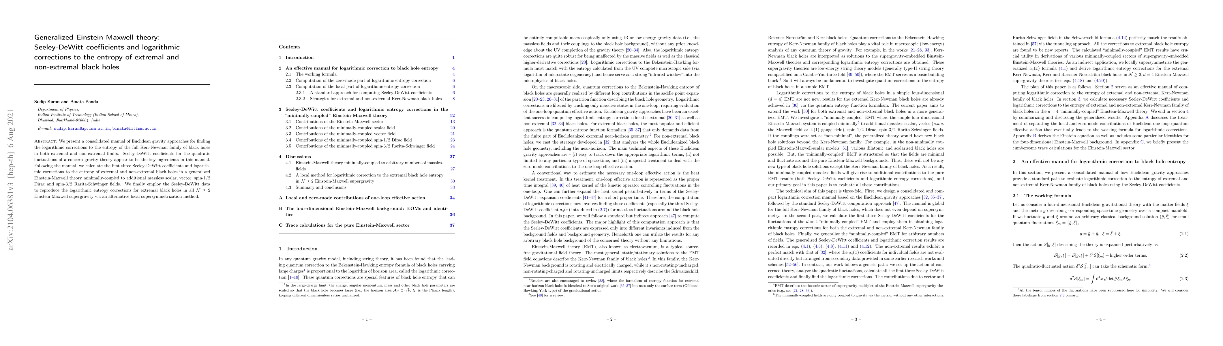 We present a consolidated manual of Euclidean gravity approaches for finding the logarithmic corrections to the entropy of the full Kerr-Newman family of black holes in both extremal and non-extremal limits. Seeley-DeWitt coefficients for the quadratic fluctuations of a concern gravity theory appear to be the key ingredients in this manual. Following the manual, we calculate the first three Seeley-DeWitt coefficients and logarithmic corrections to the entropy of extremal and non-extremal black holes in a generalized Einstein-Maxwell theory minimally-coupled to additional massless scalar, vector, spin-1/2 Dirac and spin-3/2 Rarita-Schwinger fields. We finally employ the Seeley-DeWitt data to reproduce the logarithmic entropy corrections for extremal black holes in all $\mathcal{N} \geq 2$ Einstein-Maxwell supergravity via an alternative local supersymmetrization method.