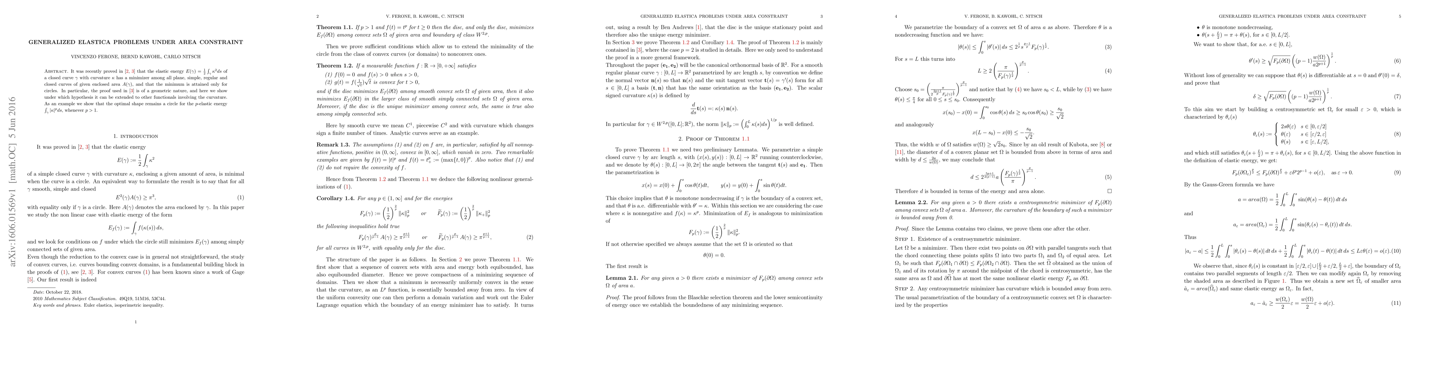 It was recently proved that the elastic energy $E(\gamma)=\tfrac{1}{2}\int_\gamma\kappa^2 ds$ of a closed curve $\gamma$ with curvature $\kappa$ has a minimizer among all plane, simple, regular and closed curves of given enclosed area $A(\gamma)$, and that the minimum is attained only for circles. Here we show under which hypothesis the result can be extended to other functionals involving the curvature. As an example we show that the optimal shape remains a circle for the $p$-elastic energy $\int_\gamma|\kappa|^p ds$, whenever $p>1$.