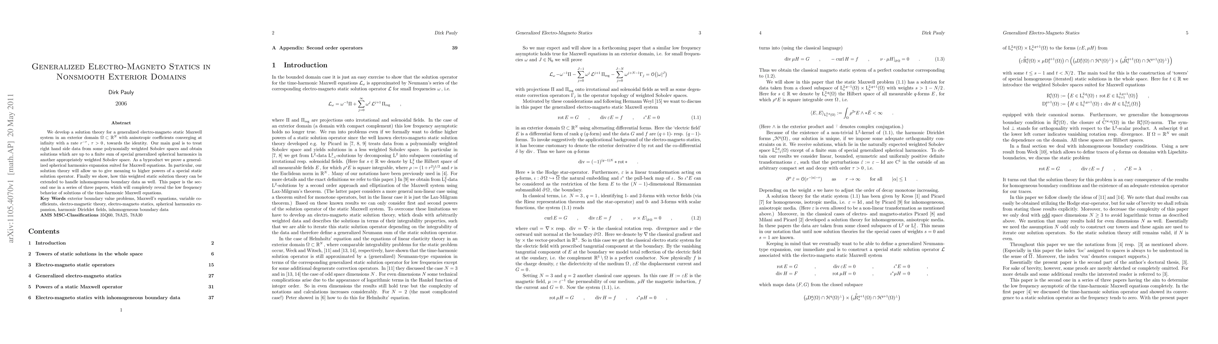 This paper develops a solution theory for generalized electro-magneto static Maxwell equations in nonsmooth exterior domains with anisotropic coefficients. It aims to treat right-hand side data from polynomially weighted Sobolev spaces and obtain solutions expressed in terms of generalized spherical harmonics in another weighted Sobolev space.