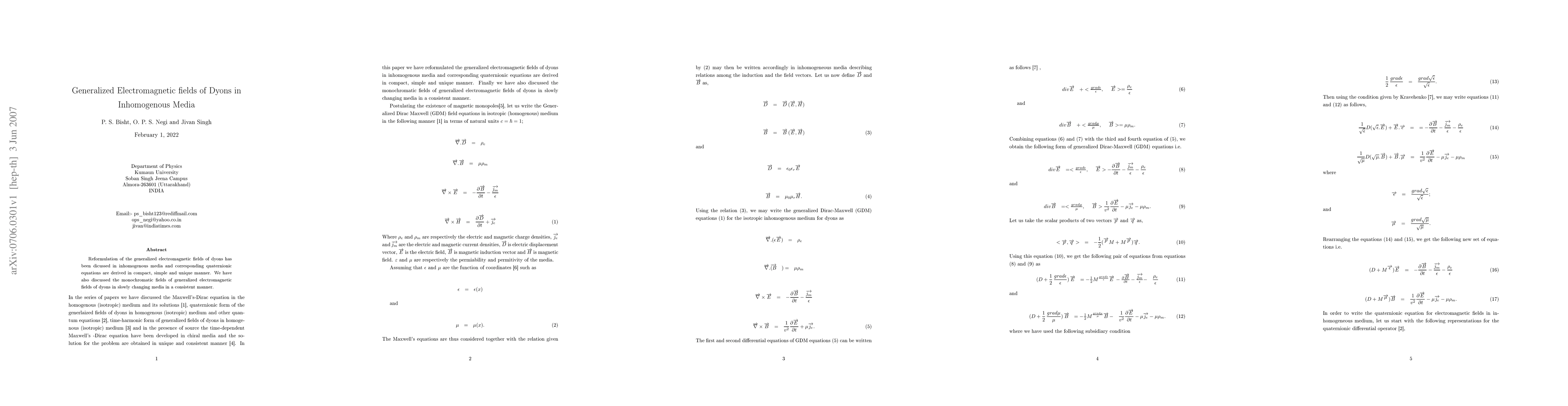 This paper reformulates the generalized electromagnetic fields of dyons in inhomogeneous media, deriving corresponding quaternionic equations in a compact and unique manner. It also explores the monochromatic fields of dyons in slowly changing media consistently.