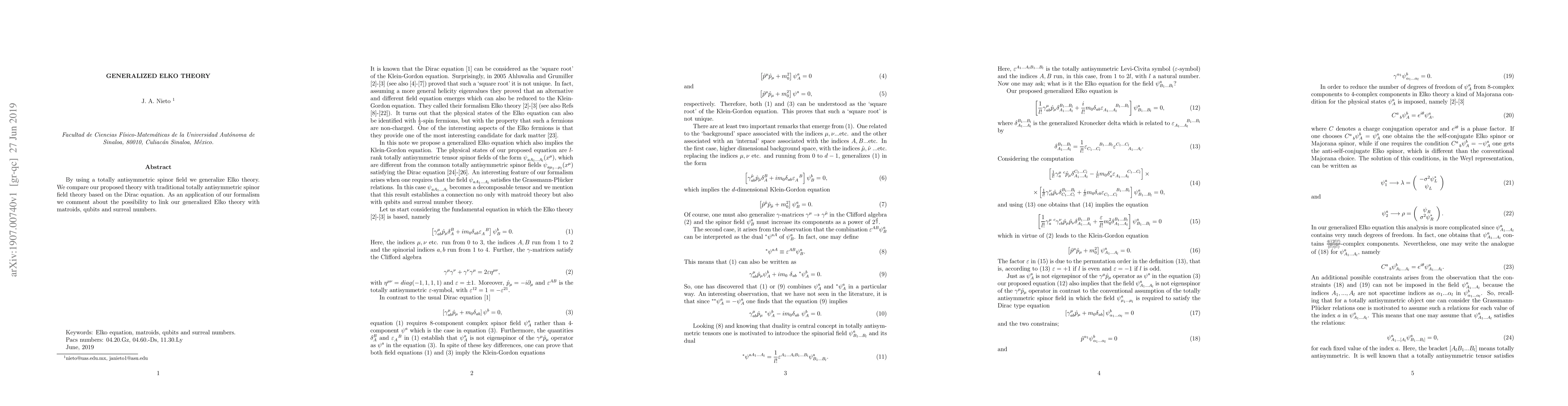 This paper generalizes Elko theory by introducing a totally antisymmetric spinor field, comparing it to traditional Dirac-based theories, and explores its potential connections to matroids, qubits, and surreal numbers. The study aims to extend the theoretical framework for understanding these advanced mathematical constructs.