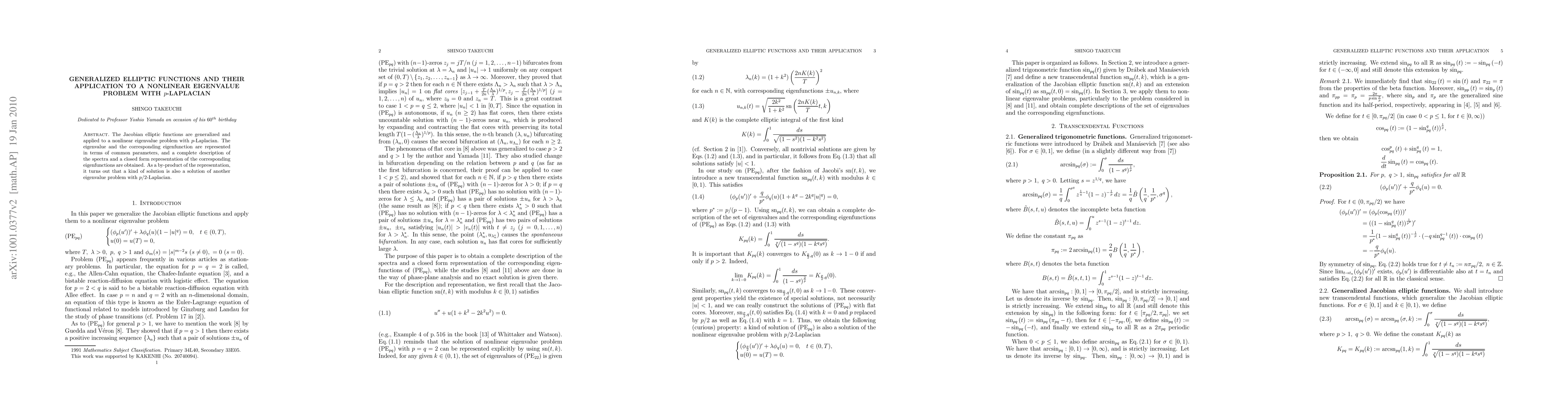 The Jacobian elliptic functions are generalized and applied to a nonlinear eigenvalue problem with $p$-Laplacian. The eigenvalue and the corresponding eigenfunction are represented in terms of common parameters, and a complete description of the spectra and a closed form representation of the corresponding eigenfunctions are obtained. As a by-product of the representation, it turns out that a kind of solution is also a solution of another eigenvalue problem with $p/2$-Laplacian.