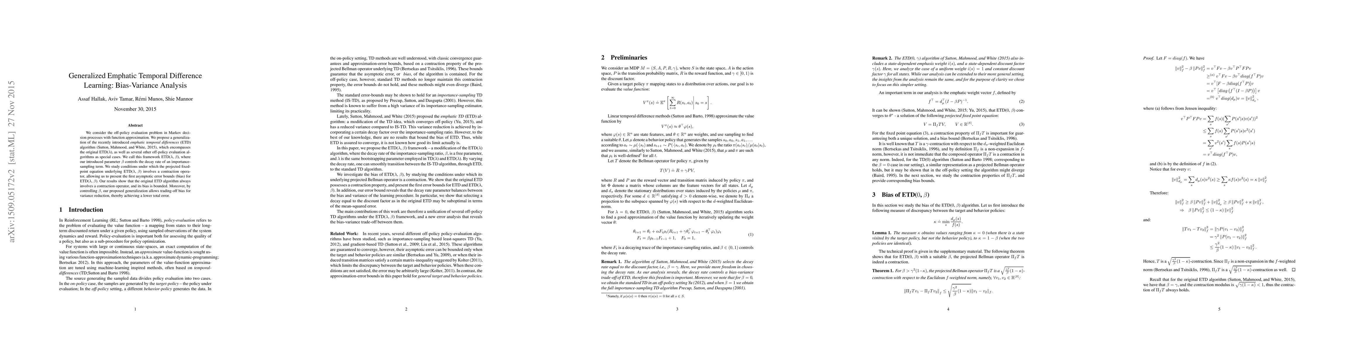 We consider the off-policy evaluation problem in Markov decision processes with function approximation. We propose a generalization of the recently introduced \emph{emphatic temporal differences} (ETD) algorithm \citep{SuttonMW15}, which encompasses the original ETD($\lambda$), as well as several other off-policy evaluation algorithms as special cases. We call this framework \ETD, where our introduced parameter $\beta$ controls the decay rate of an importance-sampling term. We study conditions under which the projected fixed-point equation underlying \ETD\ involves a contraction operator, allowing us to present the first asymptotic error bounds (bias) for \ETD. Our results show that the original ETD algorithm always involves a contraction operator, and its bias is bounded. Moreover, by controlling $\beta$, our proposed generalization allows trading-off bias for variance reduction, thereby achieving a lower total error.
