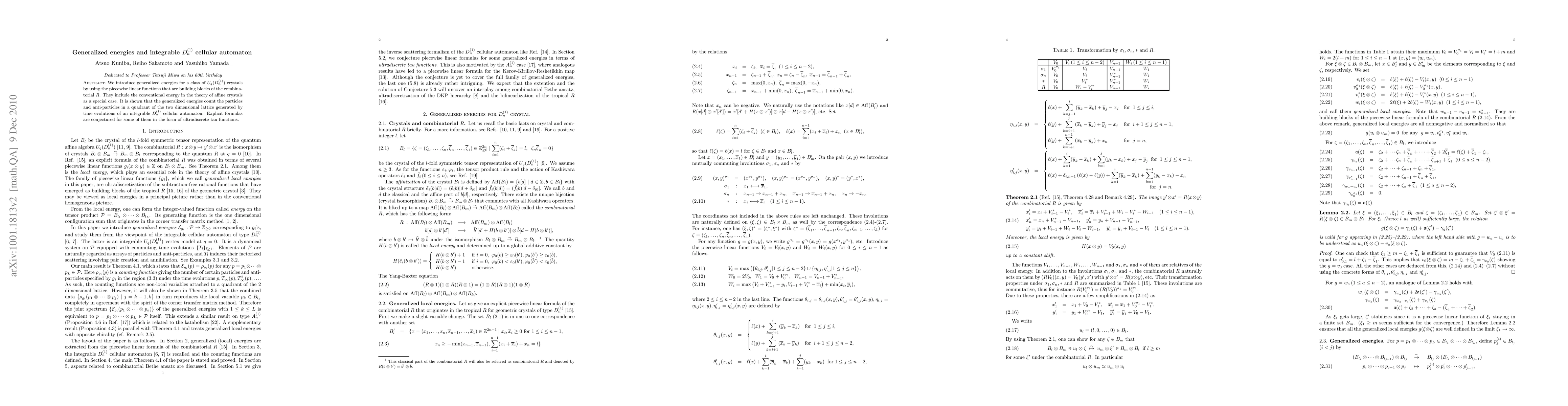 We introduce generalized energies for a class of U_q(D^{(1)}_n) crystals by using the piecewise linear functions that are building blocks of the combinatorial R. They include the conventional energy in the theory of affine crystals as a special case. It is shown that the generalized energies count the particles and anti-particles in a quadrant of the two dimensional lattice generated by time evolutions of an integrable D^{(1)}_n cellular automaton. Explicit formulas are conjectured for some of them in the form of ultradiscrete tau functions.