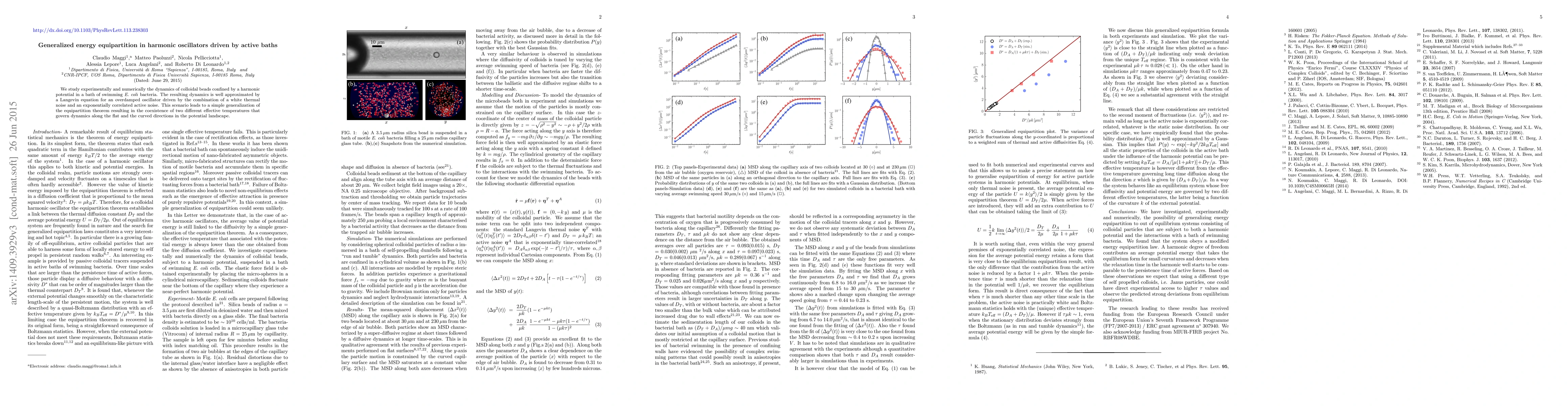 We study experimentally and numerically the dynamics of colloidal beads confined by a harmonic potential in a bath of swimming E. coli bacteria. The resulting dynamics is well approximated by a Langevin equation for an overdamped oscillator driven by the combination of a white thermal noise and an exponentially correlated active noise. This scenario leads to a simple generalization of the equipartition theorem resulting in the coexistence of two different effective temperatures that govern dynamics along the flat and the curved directions in the potential landscape.