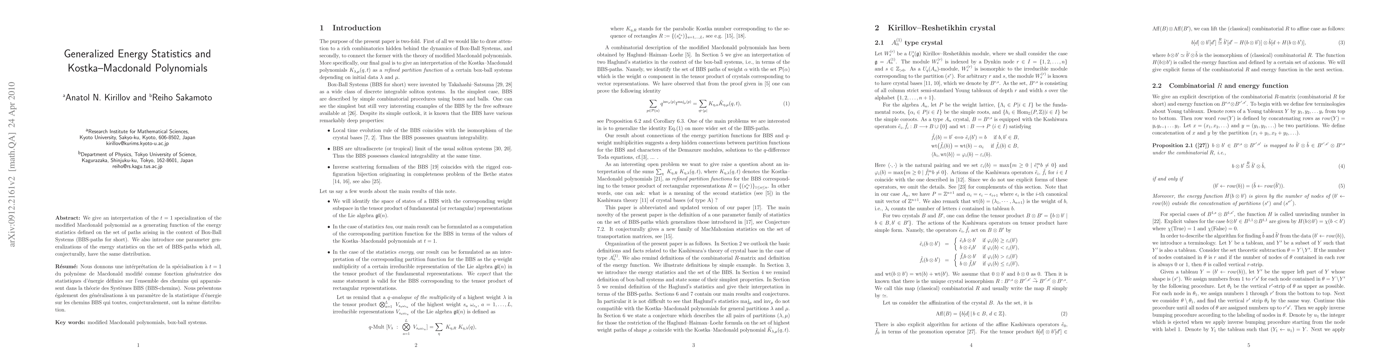 The paper interprets a modified Macdonald polynomial as a generating function for energy statistics on Box-Ball System paths, introducing one-parameter generalizations with the same distribution.
