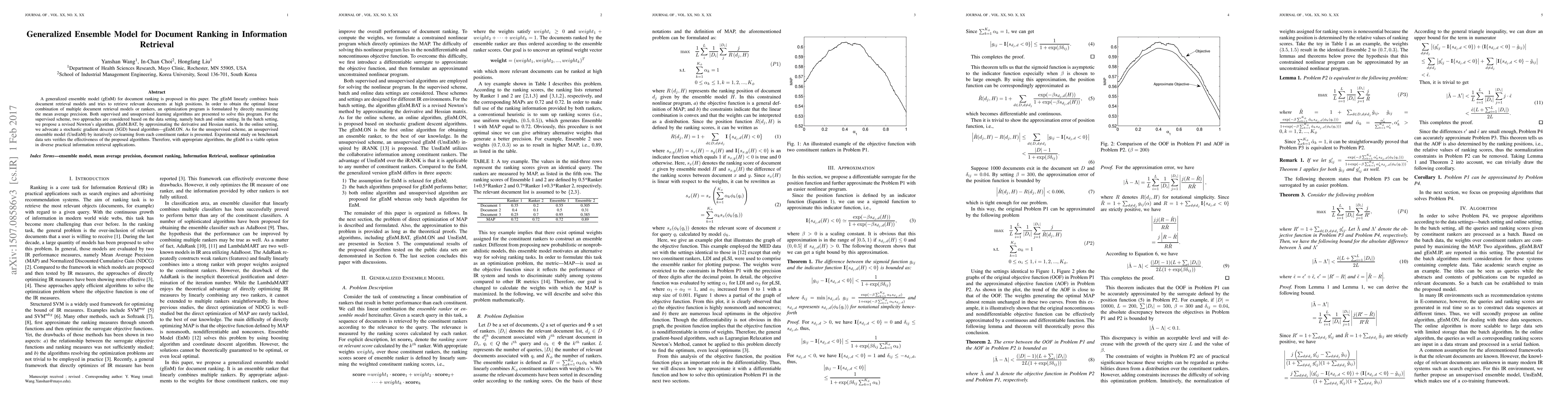 This paper proposes a generalized ensemble model (gEnM) for document ranking in information retrieval, which optimally combines multiple retrieval models to achieve higher relevance rankings. The model employs both supervised and unsupervised learning algorithms, including a revised Newton's algorithm and stochastic gradient descent, to maximize mean average precision, demonstrating effectiveness in practical applications.