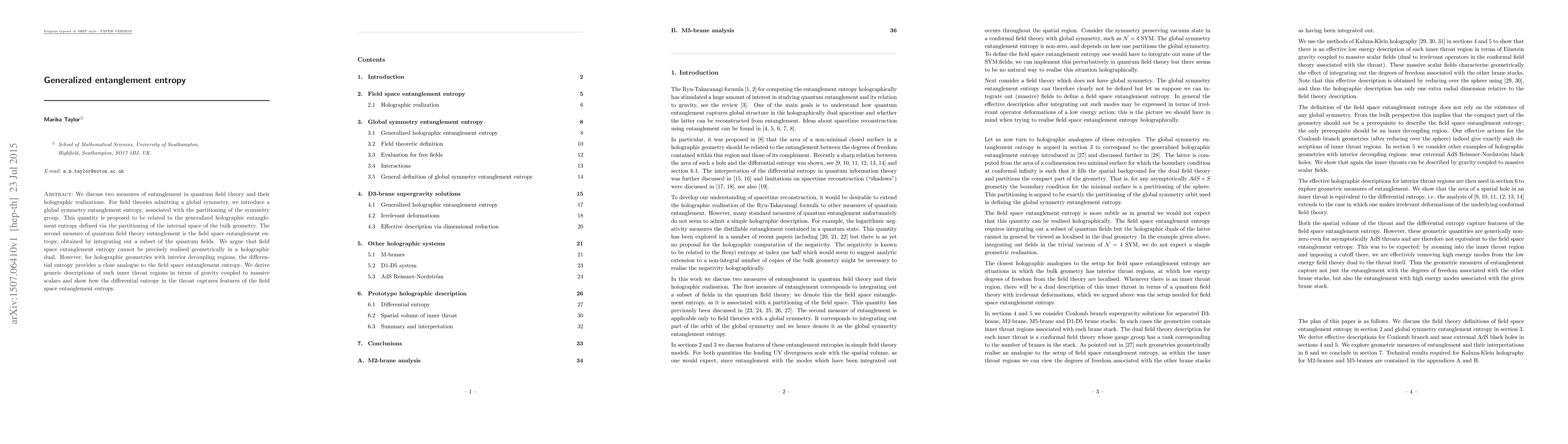 We discuss two measures of entanglement in quantum field theory and their holographic realizations. For field theories admitting a global symmetry, we introduce a global symmetry entanglement entropy, associated with the partitioning of the symmetry group. This quantity is proposed to be related to the generalized holographic entanglement entropy defined via the partitioning of the internal space of the bulk geometry. The second measure of quantum field theory entanglement is the field space entanglement entropy, obtained by integrating out a subset of the quantum fields. We argue that field space entanglement entropy cannot be precisely realised geometrically in a holographic dual. However, for holographic geometries with interior decoupling regions, the differential entropy provides a close analogue to the field space entanglement entropy. We derive generic descriptions of such inner throat regions in terms of gravity coupled to massive scalars and show how the differential entropy in the throat captures features of the field space entanglement entropy.