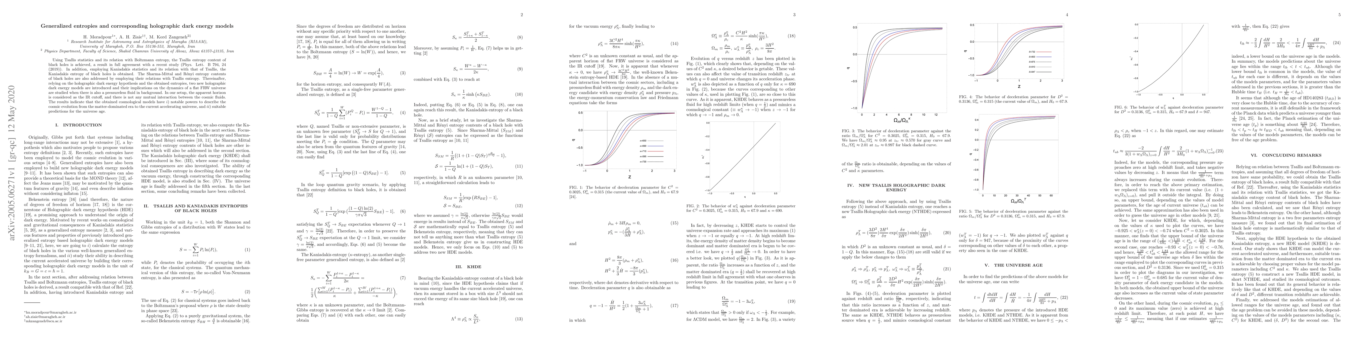This paper explores generalized entropies derived from Tsallis and Kaniadakis statistics applied to black holes, and uses these to propose two new holographic dark energy models. The models describe cosmic evolution from the matter-dominated era to the current accelerating universe, providing suitable predictions for the universe's age.