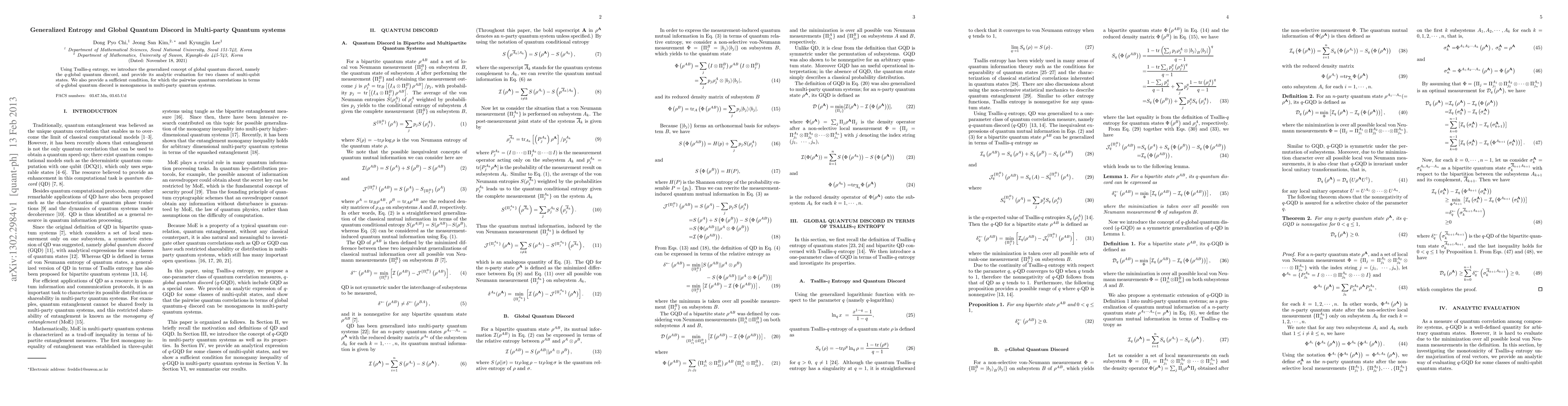 This paper introduces the q-global quantum discord using Tsallis-q entropy and evaluates it analytically for two classes of multi-qubit states. It also establishes a condition for the monogamy of pairwise quantum correlations in multi-party systems.
