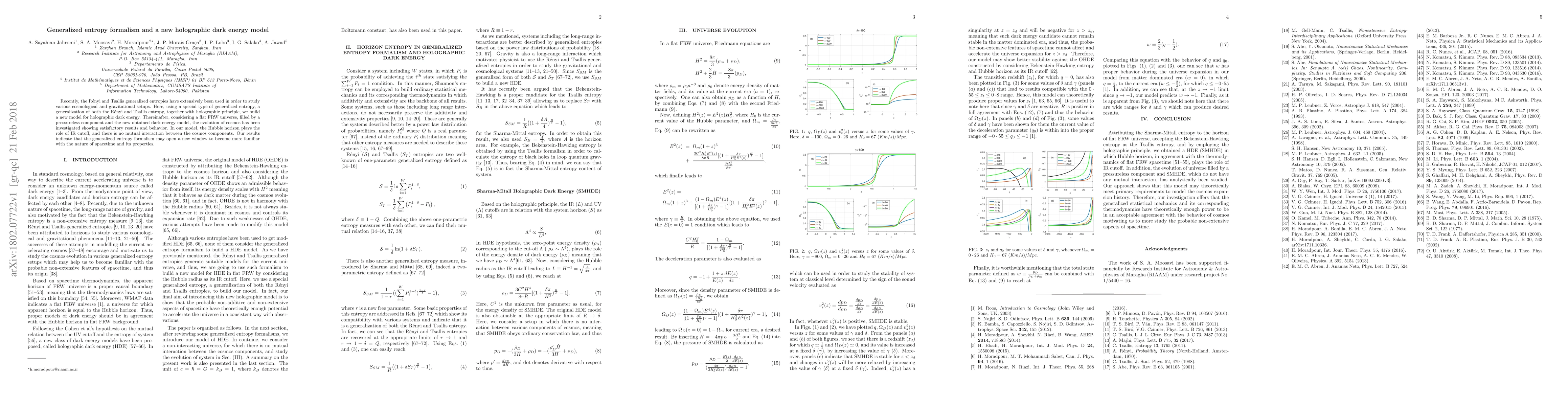 This paper proposes a new holographic dark energy model using a generalized entropy formalism that combines Rényi and Tsallis entropies with the holographic principle. The model, applied to a flat FRW universe, demonstrates satisfactory cosmological evolution, suggesting that this approach could enhance our understanding of spacetime properties.