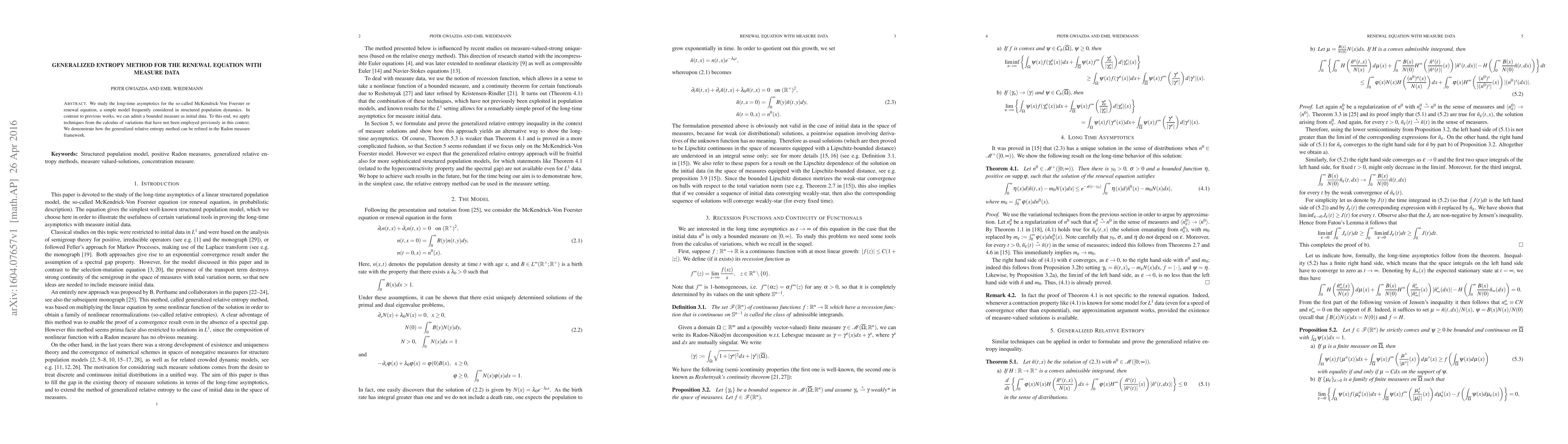 This paper investigates the long-term behavior of the renewal equation in population dynamics using the generalized entropy method, allowing for bounded measure initial data. It employs novel techniques from the calculus of variations to refine the analysis within the Radon measure framework.