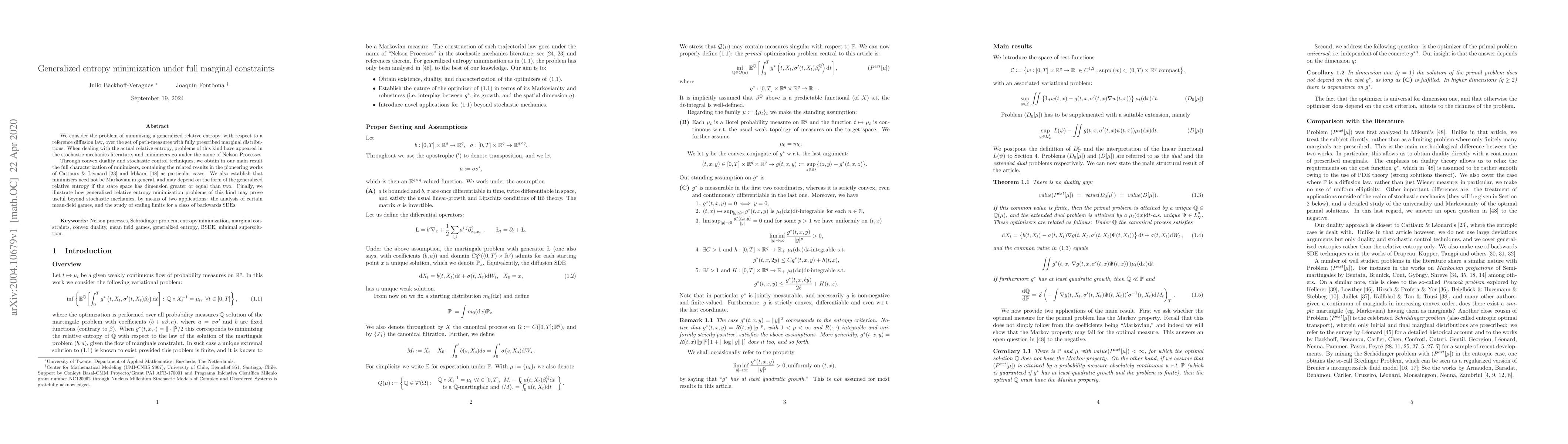 This paper characterizes minimizers of generalized relative entropy under full marginal constraints using convex duality and stochastic control. It shows that minimizers can be non-Markovian and depend on the entropy form, with applications to mean-field games and scaling limits for backwards SDEs.