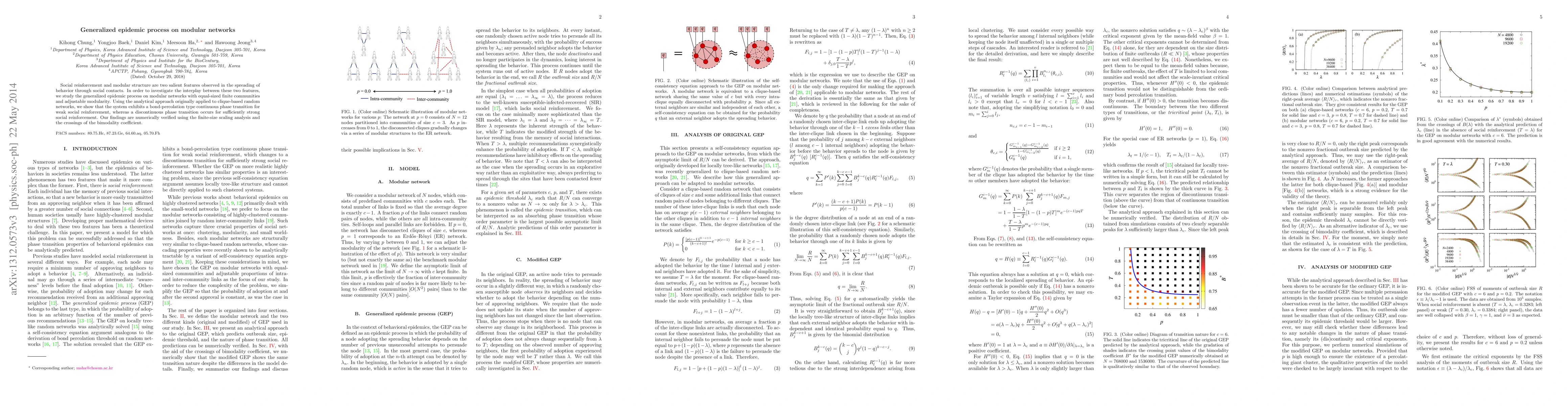 Social reinforcement and modular structure are two salient features observed in the spreading of behavior through social contacts. In order to investigate the interplay between these two features, we study the generalized epidemic process on modular networks with equal-sized finite communities and adjustable modularity. Using the analytical approach originally applied to clique-based random networks, we show that the system exhibits a bond-percolation type continuous phase transition for weak social reinforcement, whereas a discontinuous phase transition occurs for sufficiently strong social reinforcement. Our findings are numerically verified using the finite-size scaling analysis and the crossings of the bimodality coefficient.
