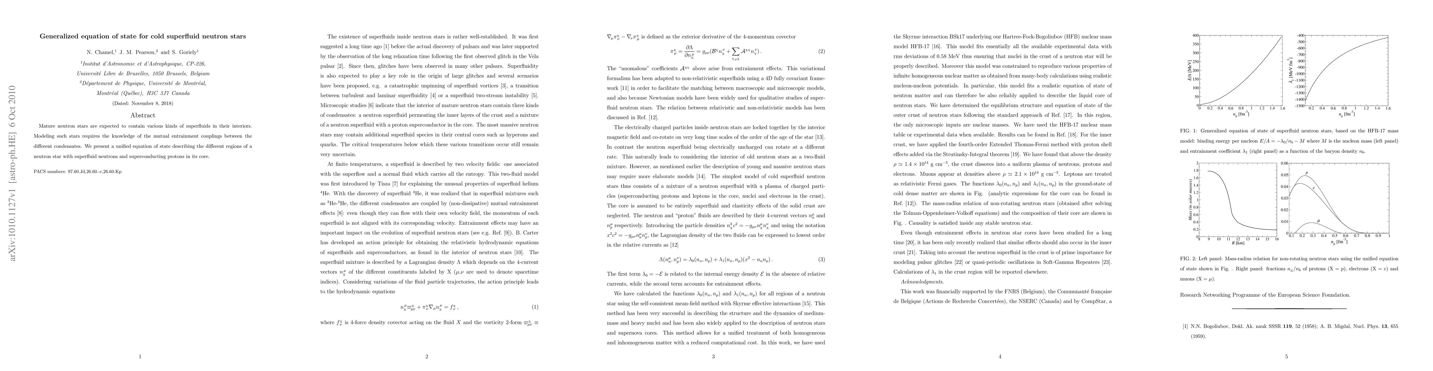 This paper develops a generalized equation of state for cold superfluid neutron stars, incorporating the mutual entrainment couplings between superfluid neutrons and superconducting protons in their cores to accurately model mature neutron stars.