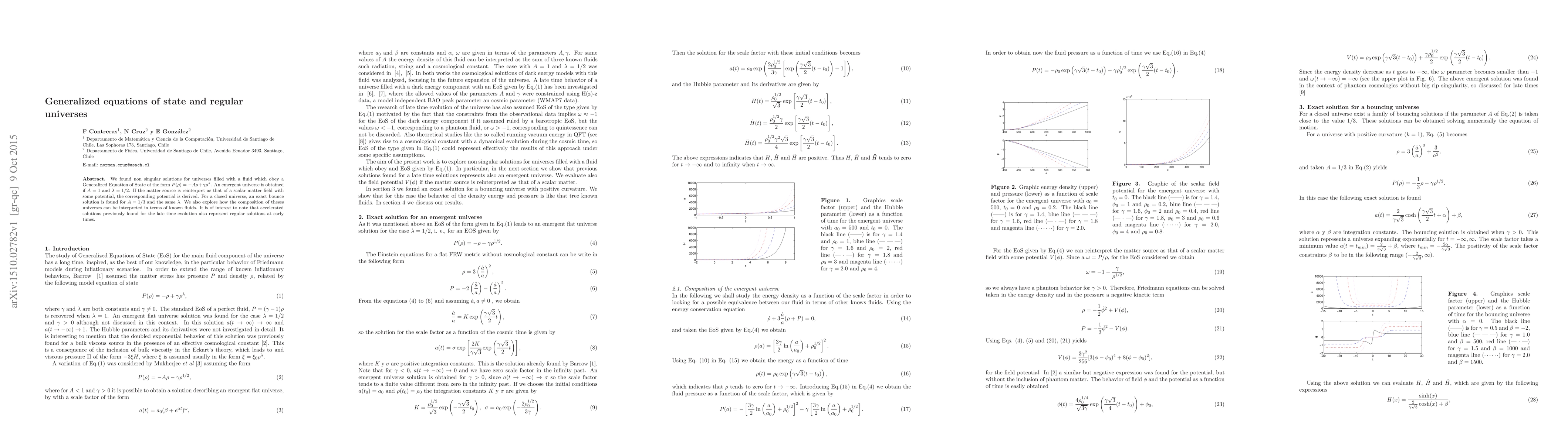 We found non singular solutions for universes filled with a fluid which obey a Generalized Equation of State of the form $P(\rho)=-A\rho+\gamma\rho^{\lambda}$. An emergent universe is obtained if $A=1$ and $\lambda =1/2$. If the matter source is reinterpret as that of a scalar matter field with some potential, the corresponding potential is derived. For a closed universe, an exact bounce solution is found for $A=1/3$ and the same $\lambda $. We also explore how the composition of theses universes can be interpreted in terms of known fluids. It is of interest to note that accelerated solutions previously found for the late time evolution also represent regular solutions at early times.